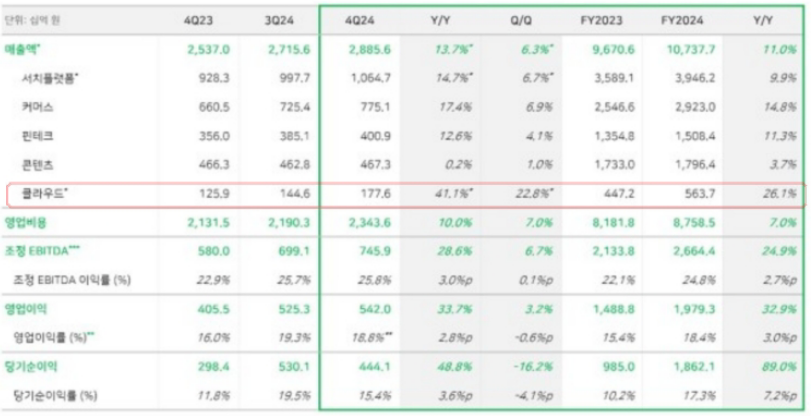 해당 실적을 을 보시면 네이버 클라우드 서비스는 전년 대비 41.1% 성장했고 분기별 매출로 보아도 22.8% 성장한 수치를 보여주었습니다. 이는 클라우드 서비스를 통해 네이버가 이루어가고자 하는 방향성을 명확하게 보여주는 지표중 하나라고 생각합니다.