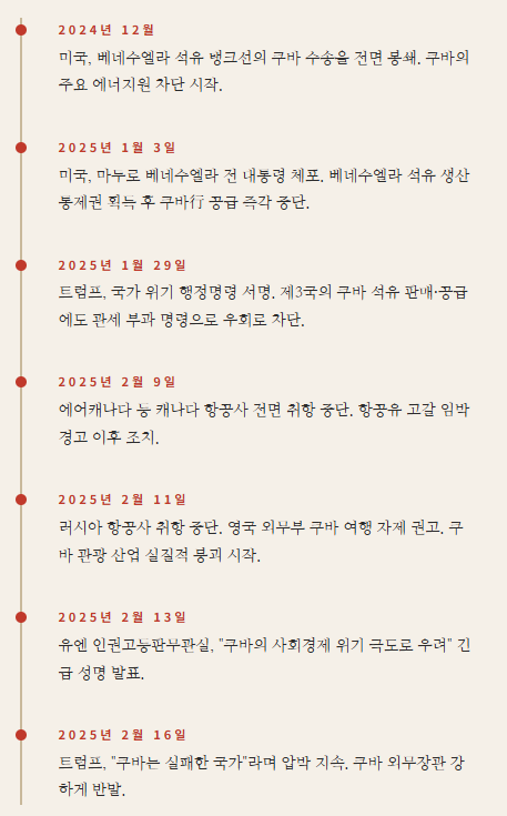 미국의 강력한 압박과 제재가 현재 쿠바의 숨통을 조이고 있습니다. 이는 결코 정치적 수사나 과장이 아닙니다. 지금 쿠바가 마주한 현실을 가장 정확하게 묘사하는 표현이라고 할 수 있습니다. 국가 기반시설이 흔들리고, 병원은 위기에 처했으며, 거리에 쓰레기가 쌓이고 하늘길마저 막혔습니다. 세계 최장의 봉쇄를 버텨온 섬나라 쿠바가 이번만큼은 그 어느 때보다 심각한 위기 앞에 서 있습니다.