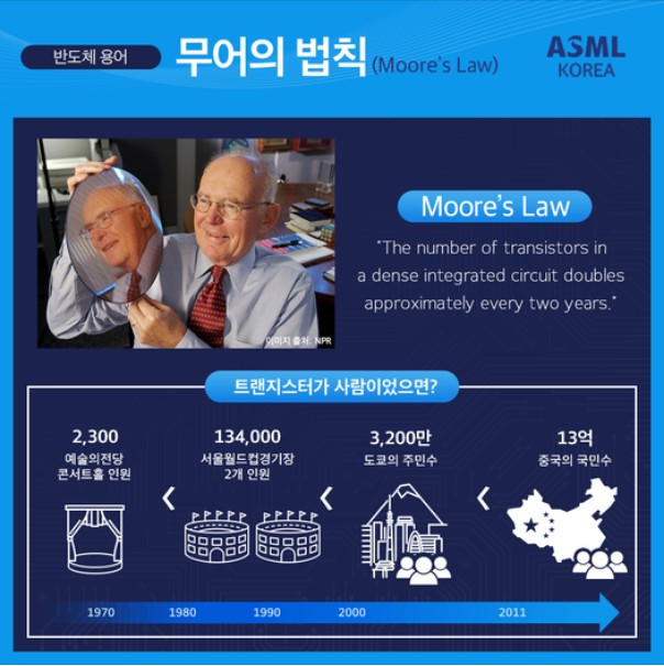 반도체의 성능을 높이는 가장 보편적인 방법은 집적도를 높이는 방법입니다. 원활한 연산 처리를 위해 한 반도체 칩 안에 집적되는 트랜지스터의 수를 획기적으로 높임을 통하여 반도체의 연산 성능을 획기적으로 높이는 것이 반도체 제조사의 숙제와도 같은 일이었습니다. 그래서 반도체 제조회사들은 어떻게 하면 한정된 너비의 칩 다이 안에 더 많은 트랜지스터를 집적할 것인가에 대해 연구했습니다. 반도체 제조회사들은 회로의 선폭을 최소화함을 통하여 집적도를 높이는 방법을 택했습니다. 그것이 바로 전 공정 단계에서 초미세 공정 경쟁을 촉발시키는 기폭제가 되었죠. 이러한 집적도 경쟁의 한복판에 무어라는 사람이 있습니다.