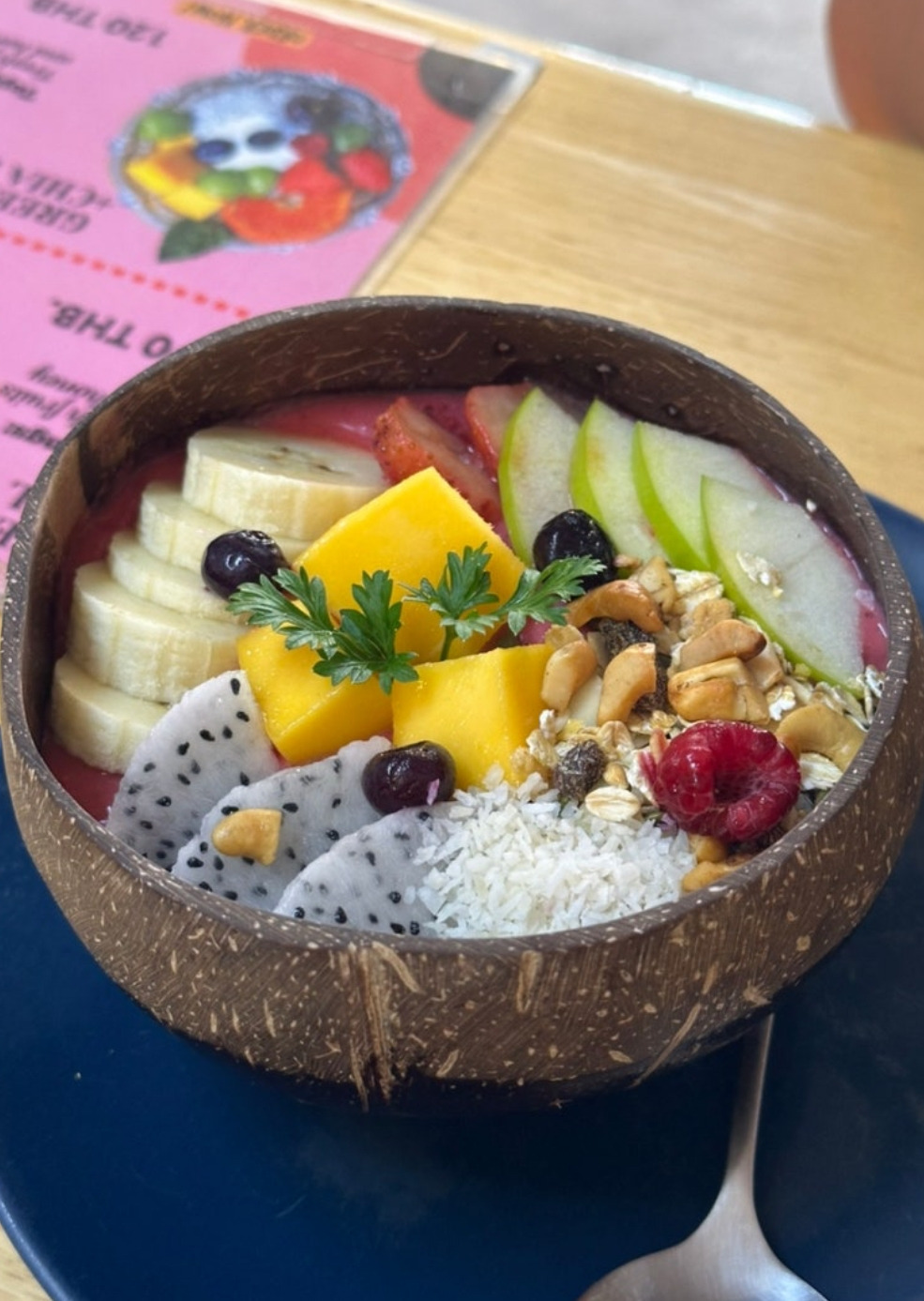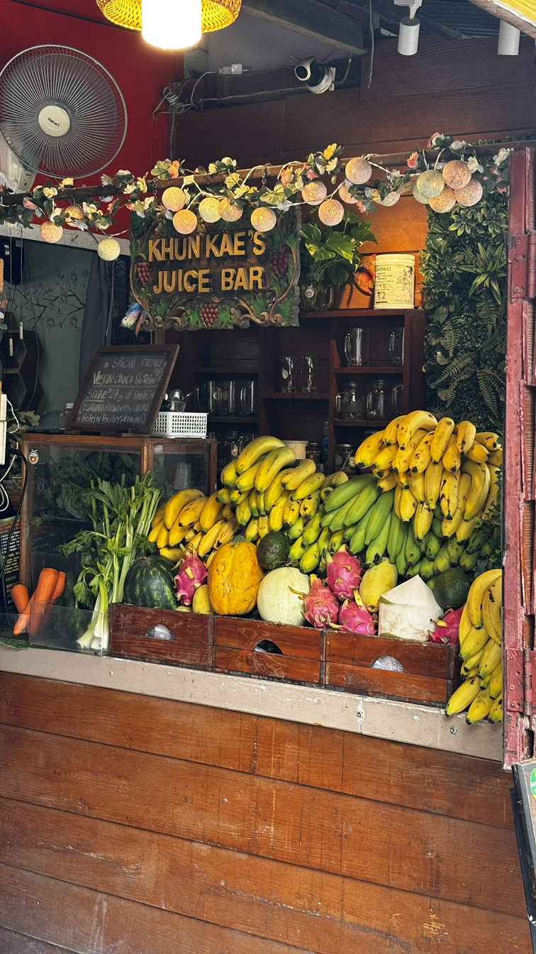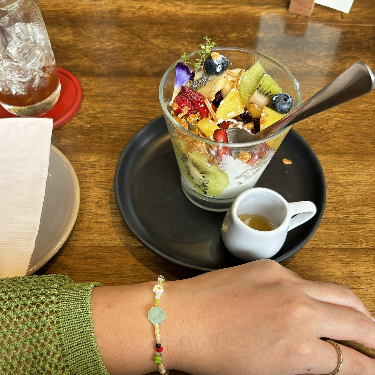 아점을 먹으러 가야지 하며, 채팅방을 보니 이번엔 점심 번개가 올라와 있었다. 어제 공연을 함께 봤던 갱지님이 올린 번개였다. 반갑기도 했고 혼자 밥을 먹으려던 참이어서 얼른 손을 들고 참여했다. 만남 장소는 올드타운이었고 약속 시간까진 아직 시간이 많이 남아 가보고 싶던 과일주스가게를 가보기로 했다. ‘쿤캐 주스바’라는 유명한 스무디 가게인데 신선한 채소와 열대과일로 스무디와 볼을 만드는 곳이었다. 설탕을 쓰지 않는 곳으로도 알려져 있다. 한국에서는 만 원이 훌쩍 넘는 아사이볼을 4,000원 정도면 먹을 수 있다고 해서 아사이볼을 먹으러 가봤다. 외관부터 온갖 과일들이 쌓여있어 누가 봐도 여기는 과일주스 가게였다. 메뉴판에는 온갖 과일과 채소 조합의 스무디들이 있었고 자신만의 레시피로 과일을 마음대로 조합해서 볼을 만들어 먹을 수도 있었다. 나는 아사이볼을 주문했다. 스무디 위에 올라간 실한 과일 토핑을 하나하나 맛보면서 선선한 바람을 느꼈다. 왜 인기 있는 곳인지 알겠다. 이후로 웨이팅이 길어져 나는 얼른 먹고 일어섰다.