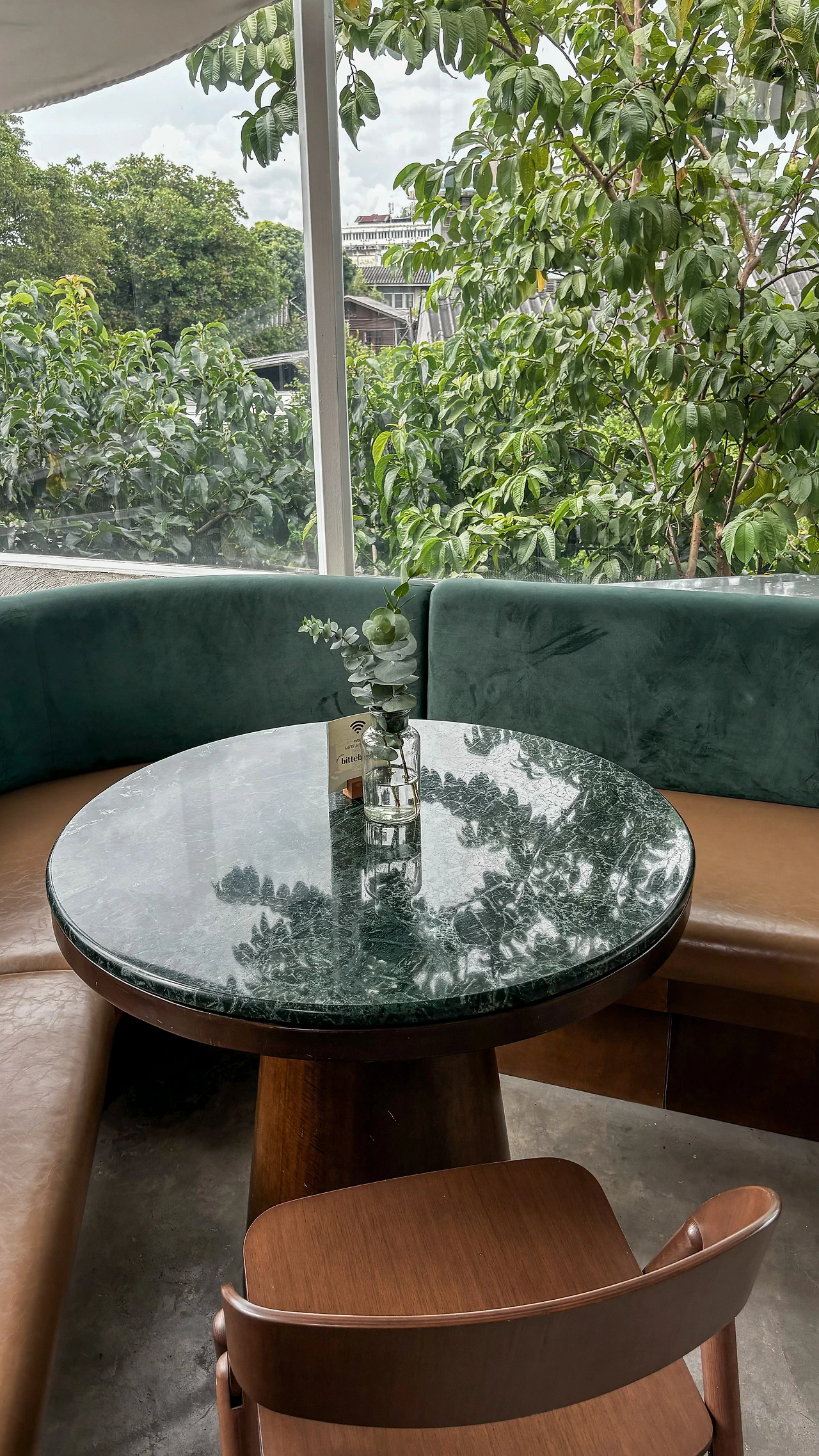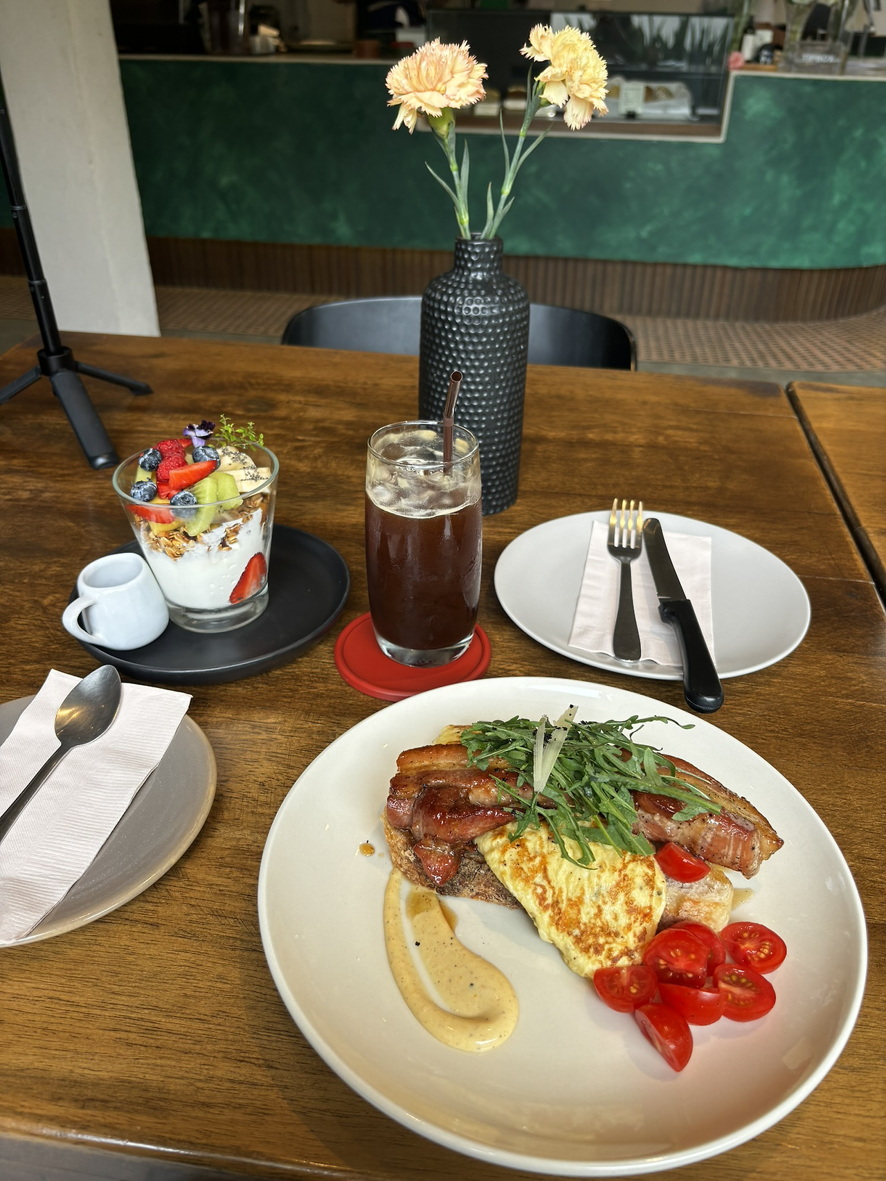 다시 자리로 돌아오니 주문한 메뉴가 나왔다. 사워도우 빵 위에 오믈렛과 엄청나게 두툼한 베이컨을 올린 요리였다. 아마도 한국사람이 보면 백이면 백 이 베이컨은 아주 익숙할 텐데, 오겹살구이라고 보면 된다. 태국에서 주문한 서양식 요리에서 한국 음식의 맛을 느끼는 그런 특별한 브런치였다. 디저트로는 과일이 들어간 요거트를 시켰는데 너무 예뻐서 한 번, 너무 본격적이어서 또 한 번 놀랐다. 브런치니까 아침+점심 합친 것만큼 먹어도 되겠지? 게다가 수영도 했으니까. 그러니 2차로 카페를 하나 정도 더 가도 될 것 같다.