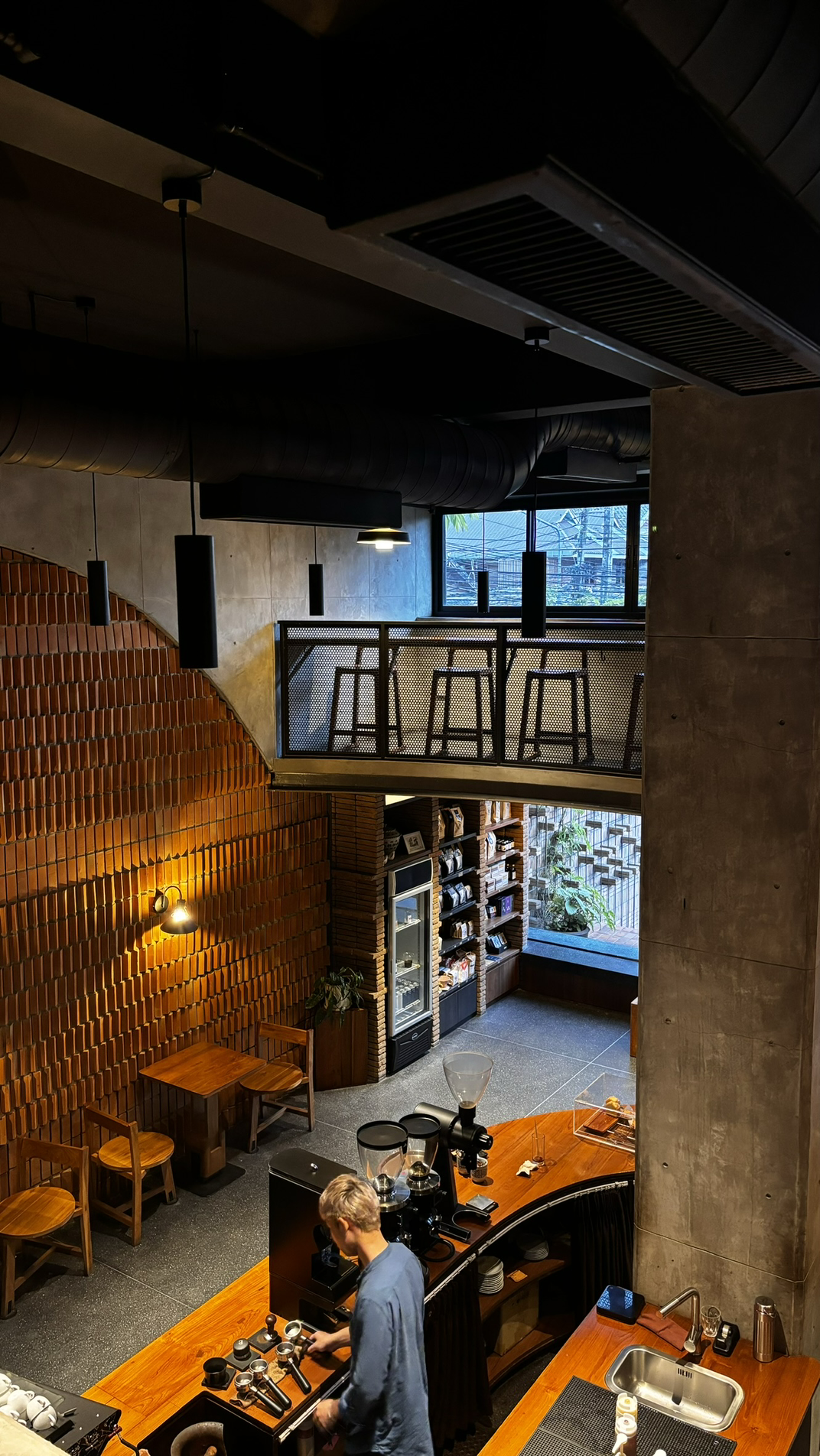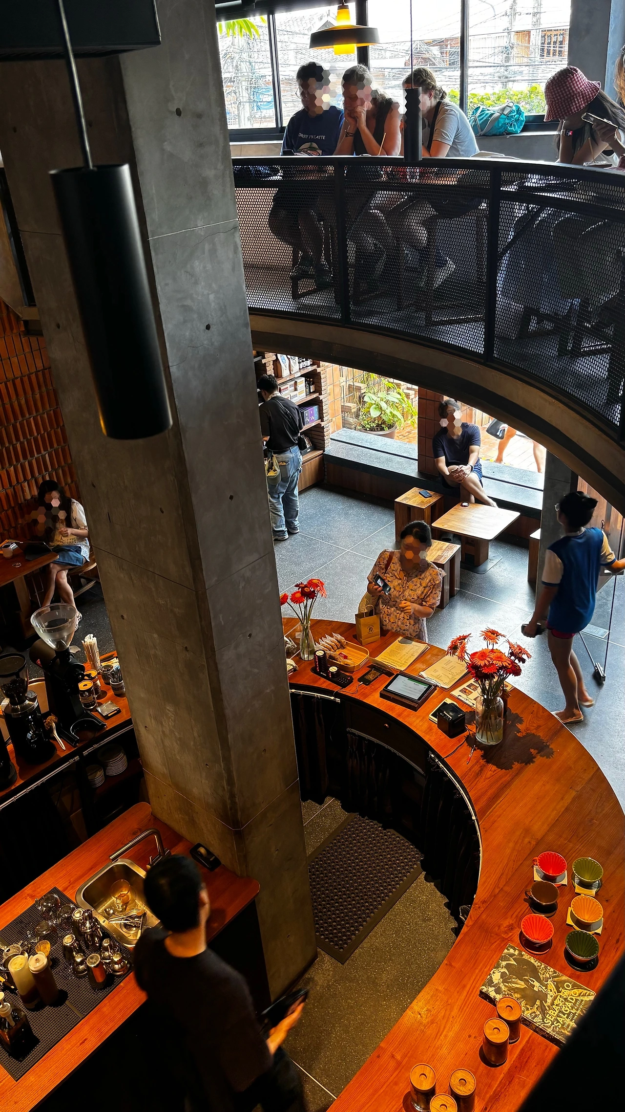 식사 후 커피는 국룰이죠. 자연스럽게 카페로 다 같이 이동했다. ‘아카 아마’라는 태국 북부의 고산족(아카족) 청년이 공동체를 위해 만든 사회적 기업이자 치앙마이 3대 커피에 꾸준히 이름을 올리는 카페로 갔다. 복층으로 구성되어 있고 가운데 오픈키친이 크게 자리한 인테리어가 트렌디했다. 정말 치앙마이 웬만한 카페들은 모두 트렌디하고 공간이 멋지다.
