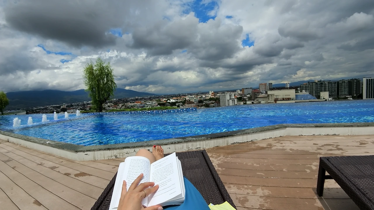그런데 이상하리만치 오늘 아침은 설레고 기운이 난다. 아무래도 이 레지던스 덕분인 것 같다. 얼른 루프탑 수영장으로 올라가 모닝수영을 해보고 싶다! 수영복으로 갈아입고 바로 17층으로 올라갔다. 아무래도 우기인지라 날이 흐리지만 수영하기엔 오히려 더 좋은 듯하다. 이른 시간이라 사람들도 많이 없고 딱이다. 경치도 구경하고, 수영도 하고, 선베드에 누워 책도 읽자면 시간이 없다.