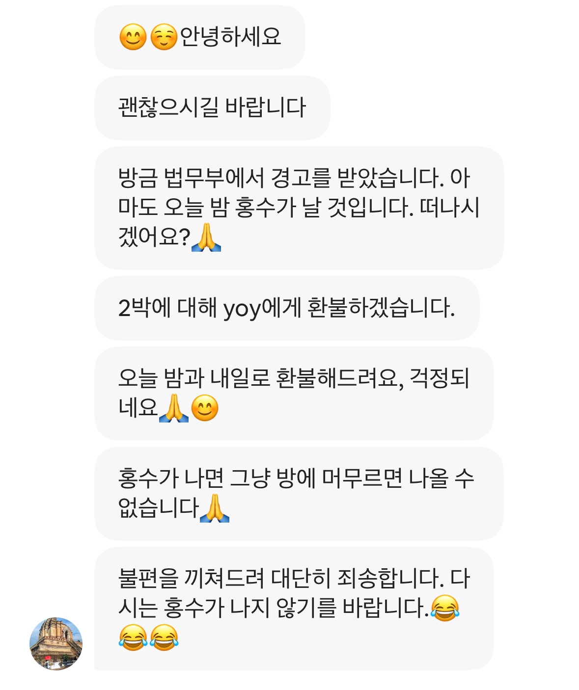 갑작스레 어디로 대피해야 하는지 막막했다. 이 콘도에서 살아보고 싶어서 치앙마이행을 결정한 것이 컸던 만큼 이곳에서 고작 3일을 지냈을 뿐인데 다른 곳으로 옮겨야 한다는 것이 믿어지지가 않았다. 지난 이틀 간의 행복한 시간이 더욱 꿈같이 느껴졌다. 집주인도 처음에는 하루이틀이면 될 것 같다고 하더니 계속해서 삥강의 수위가 높아지고 있으며 대피하라는 법무부의 경고가 잇따르자 아예 예약을 취소하고 다른 곳을 알아보는 것이 좋지 않겠냐고 했다. 내가 묵는 방의 집주인은 아주 양심적이고 나이스한 편이었다. 홍수 소식을 일찍 알려주기도 했거니와 본인의 손해를 감수하고도 2주나 남은 나의 예약을 캔슬하기를 권유했다. 나와 같은 콘도에 묵는 사람들 중에는 집주인이 아예 홍수소식을 알리지 않은 경우도 있었고 하루이틀 있으면 나아질 거라고 이야기해 대피가 늦어진 사람들도 있었다. 나는 다행히 호텔에서 준비한 트럭을 타고 대피했지만 나보다 조금 더 버티던 사람들은 결국 캐리어도 버리고, 구명보트를 타고 그곳을 빠져나왔다고 했다.