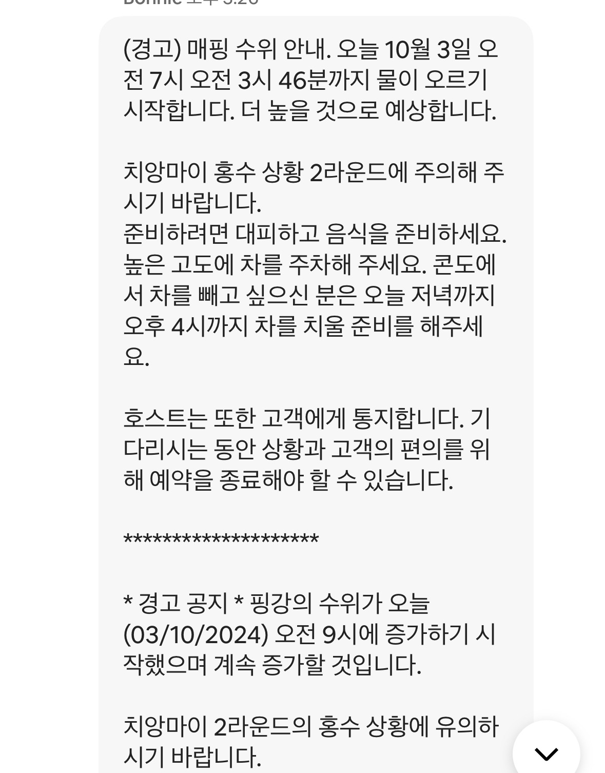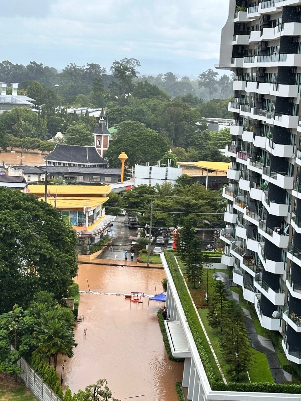 나중에 알고 보니 이 홍수는 치앙마이보다 북부에 위치한 삥강 상류지역에 호우가 며칠 동안 이어져 댐의 수문을 열어 대규모로 강물을 방류했기 때문에 발생한 것이었다. 그런 상황에서 매일 비가 내리다 보니 삥강의 수위가 높아져 범람함에 따라 주변 지역이 모두 침수되는 100년 만의 대규모 홍수라고 했다. 여행객인 나로서도 난감하고 무서운 상황이었지만 이곳에 실제로 거주하는 사람들의 피해는 엄청나게 컸을 것이다. 오픈 카톡방에서도 치앙마이에 거주하는 한인들과 여행객들이 각자의 피해상황을 공유하느라 알림이 끊이지 않고 울렸다. 지난 편에 썼듯이 삥강을 따라 고급 리조트들과 글로벌 체인 호텔들이 모여있기 때문에 관광객들이 모두 대피해야 하는 긴급 상황이었다.