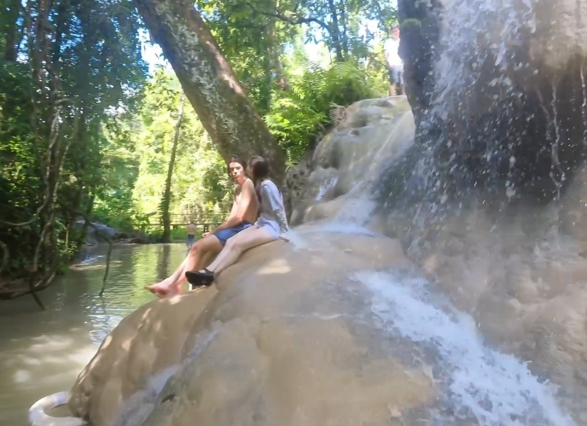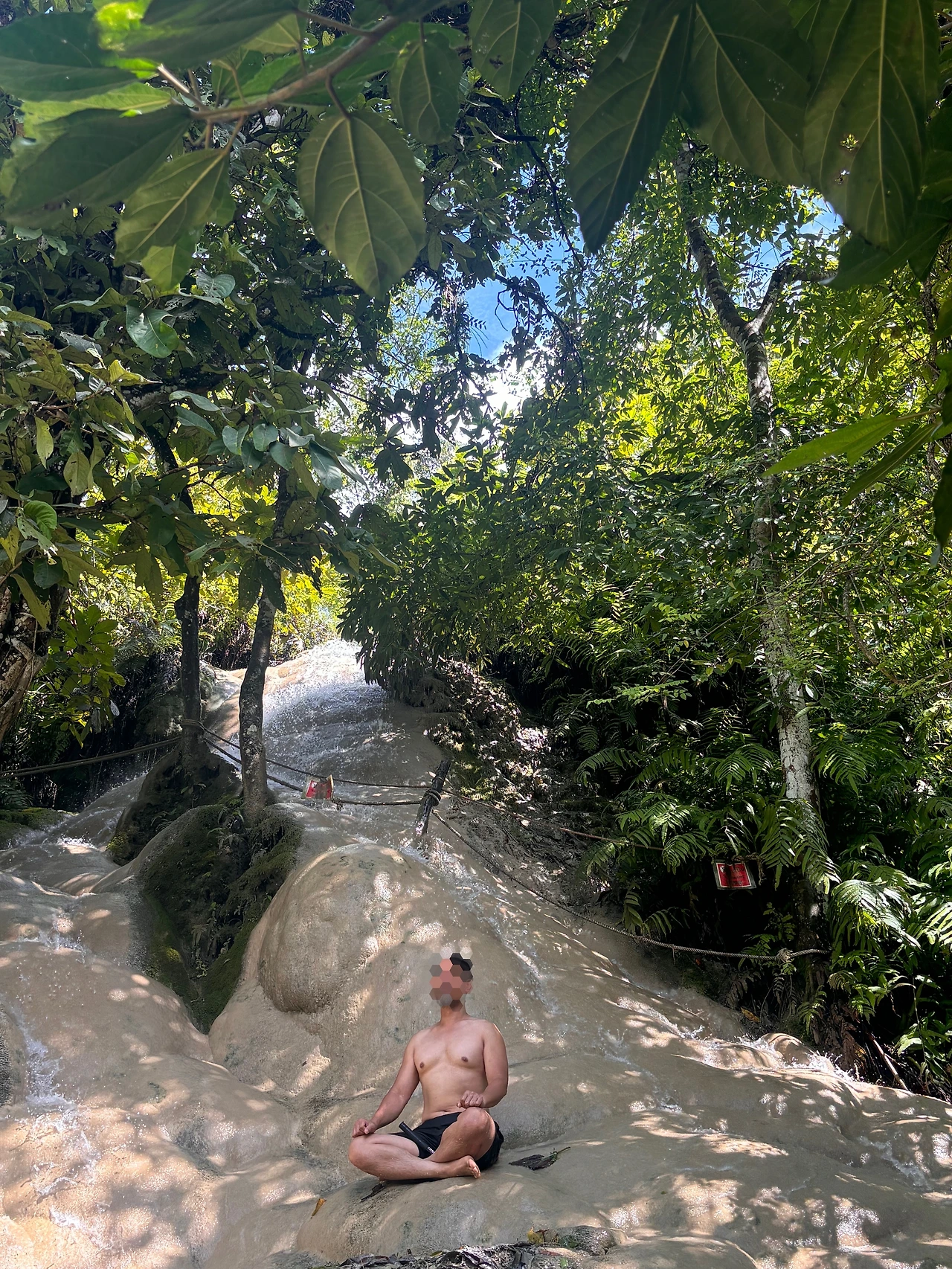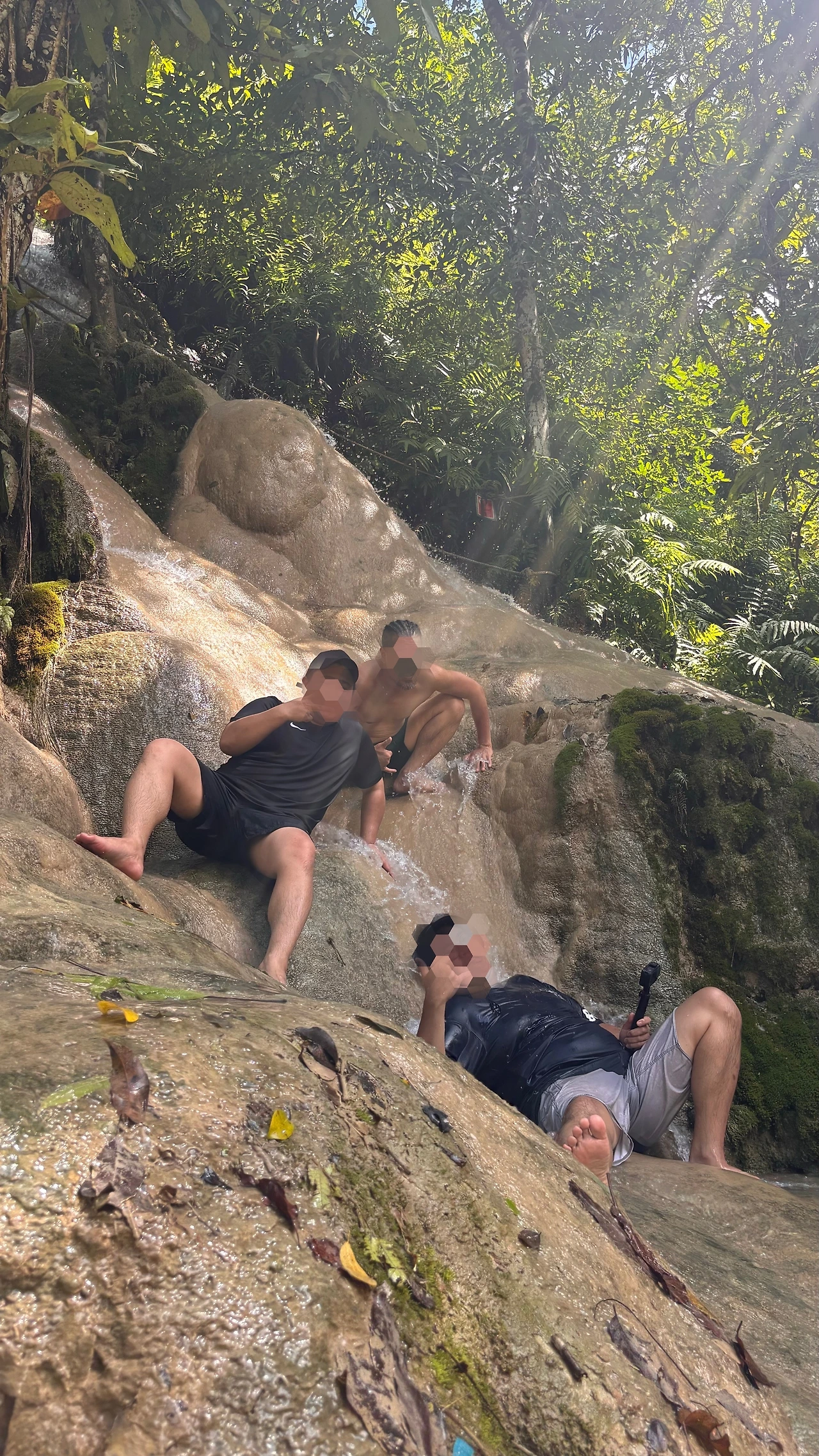 부아텅 폭포는 총 세 개의 폭포로 나눌 수 있는데 하류의 두 폭포는 경사도 완만하고 오르기 어렵지 않은데 마지막 상류 폭포는 가파르고 상대적으로 미끄러워 난이도가 있다고 했다. 주차장은 폭포의 상류에 위치하고 폭포 트레킹의 시작은 하류지역이기 때문에 걸어서 하류까지 내려갔다. 내려가는 길은 나무데크처럼 따로 마련되어 있어 맨발로 걷기에도 수월했다. 처음 입장하는 곳은 폭포의 하류 지역으로 꽤나 깊은 계곡이었다. 확실히 석회질의 물이라 물색이 뿌얘서 익숙하지는 않았지만 그 때문인지 더 이국적인 풍경으로 보이기는 했다. 한국인으로 보이는 사람은 없었고 서양인들과 중국인들이 주로 오는 듯했다. 계곡에서 몸에 물도 적시고 약간의 수영도 한 뒤, 우리는 폭포 오르기를 시작했다.