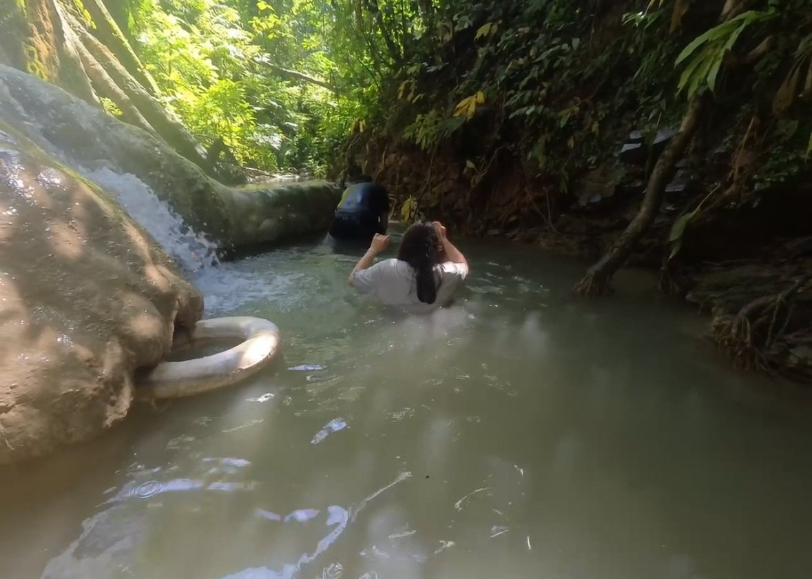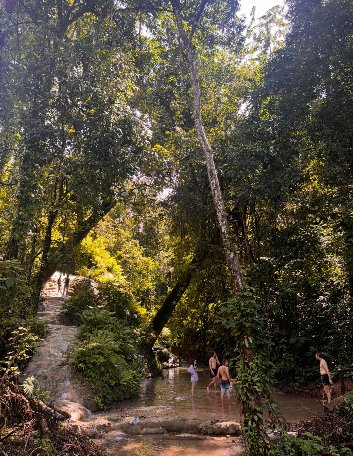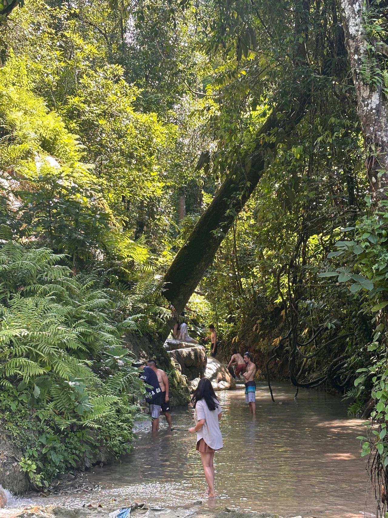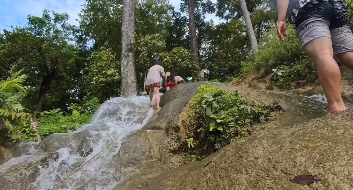 부아텅 폭포는 총 세 개의 폭포로 나눌 수 있는데 하류의 두 폭포는 경사도 완만하고 오르기 어렵지 않은데 마지막 상류 폭포는 가파르고 상대적으로 미끄러워 난이도가 있다고 했다. 주차장은 폭포의 상류에 위치하고 폭포 트레킹의 시작은 하류지역이기 때문에 걸어서 하류까지 내려갔다. 내려가는 길은 나무데크처럼 따로 마련되어 있어 맨발로 걷기에도 수월했다. 처음 입장하는 곳은 폭포의 하류 지역으로 꽤나 깊은 계곡이었다. 확실히 석회질의 물이라 물색이 뿌얘서 익숙하지는 않았지만 그 때문인지 더 이국적인 풍경으로 보이기는 했다. 한국인으로 보이는 사람은 없었고 서양인들과 중국인들이 주로 오는 듯했다. 계곡에서 몸에 물도 적시고 약간의 수영도 한 뒤, 우리는 폭포 오르기를 시작했다.
