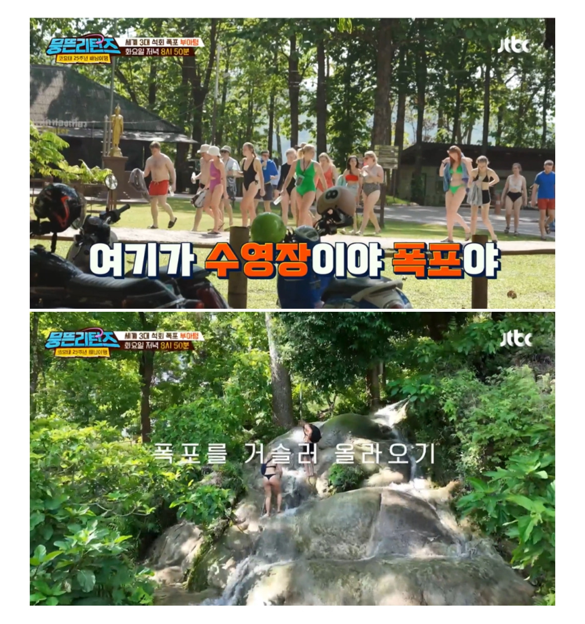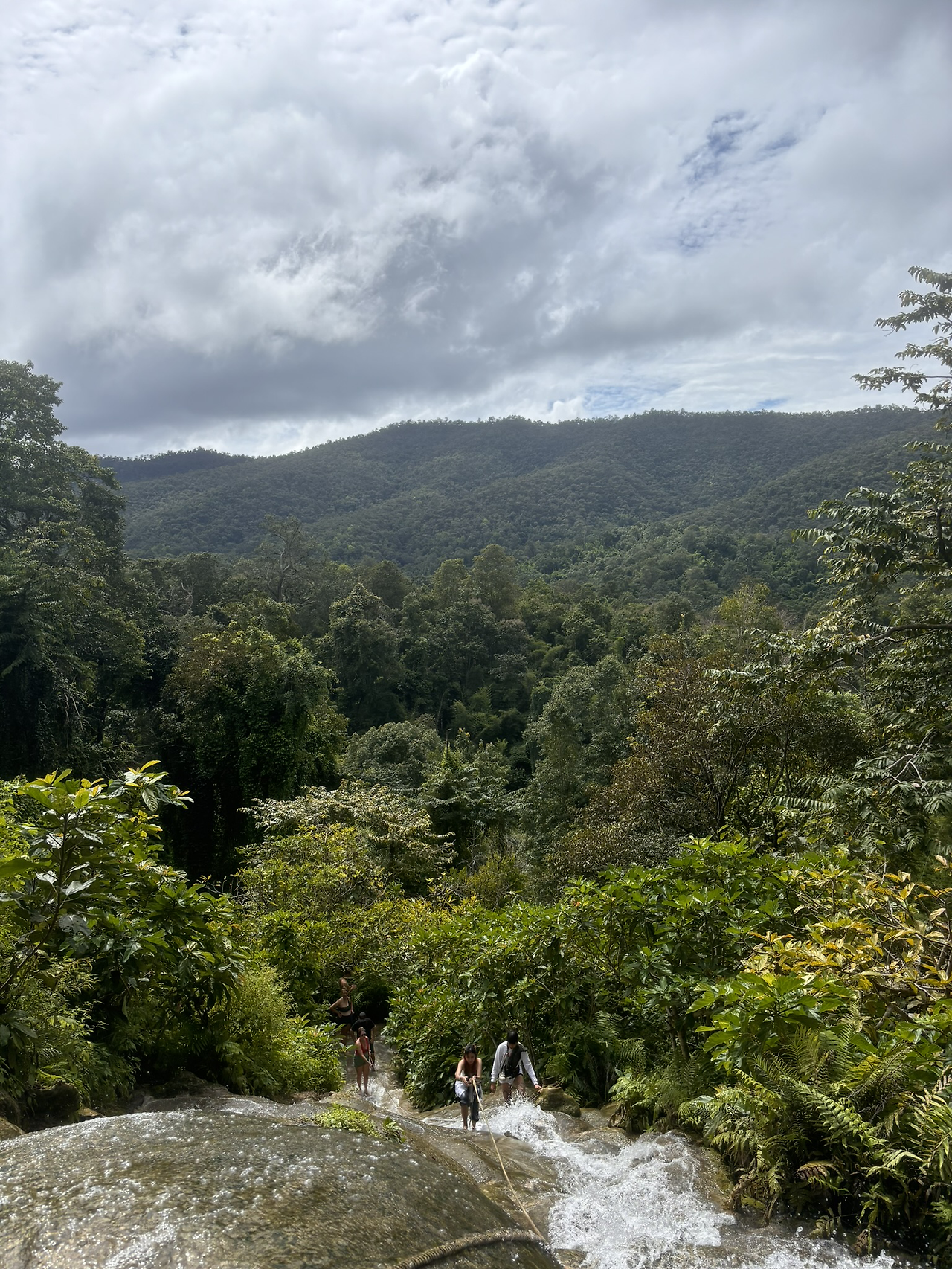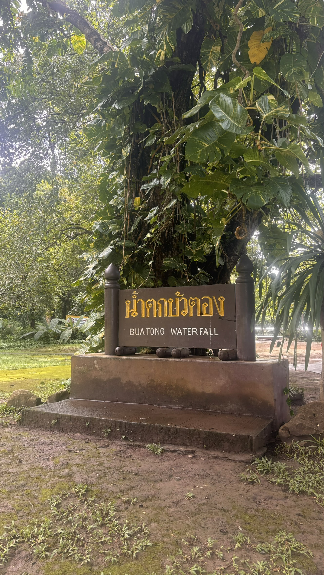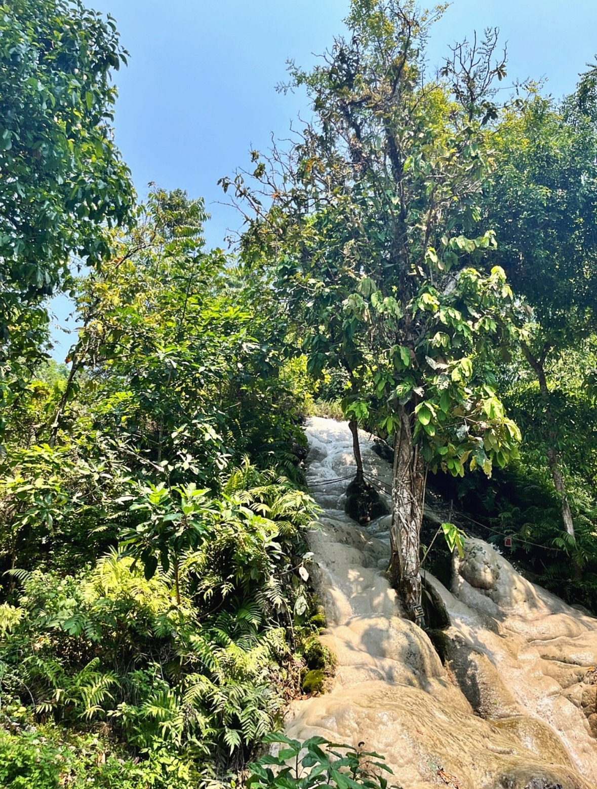 아, 다시 폭포 투어로 돌아가보자면 부아떵 폭포는 치앙마이 시내에서 북쪽으로 60km 떨어진 매땡지역의 국립공원 안에 위치해 있다. 이 폭포는 끈적폭포(sticky waterfall)라고 불리어 나의 호기심을 자극했다. 폭포가 어떻길래 끈적하다는 별명이 붙었을까. 이 부아텅폭포는 칼슘이 풍부한 물이 석회암을 타고 흘러내리는 세계 3대 석회폭포 중 하나였다. 석회질의 물 덕분에 이끼 등이 끼지 않아 바위가 하나도 미끄럽지 않게 되는 것이었다. 이 도시에서 2주간 지내는 동안 맛있는 음식도 먹고, 수영도 하고, 요가도 하고, 예쁜 카페도 다니면서 충분히 휴식을 했지만 치앙마이라는 여행지는 이렇다 할 액티비티가 많지는 않은 곳이라 아쉬움도 있었다. 여행책에 짚라인이나 국립공원 트레킹 등의 액티비티가 있었지만 별다른 흥미를 느끼지 못하다가, 어디서나 쉽게 할 수 없는 ‘폭포 트레킹‘을 보고는 직접 해보고 싶었던 것이다. 울창한 숲에서 수영복을 입고 밧줄을 잡은 채 맨발로 폭포를 거슬러 오르는 투어 사진이 나를 매료시켰다. 당시에는 몰랐지만 우리나라 방송에서도 한 번 소개한 적이 있었다고 했다.