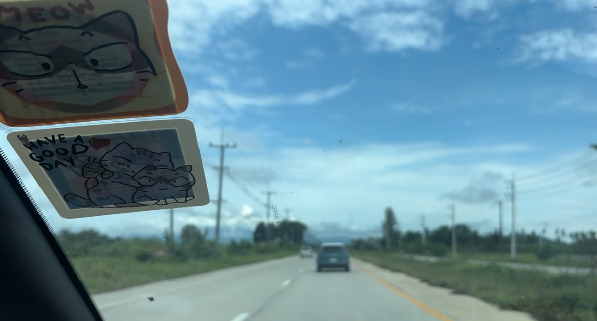 나의 가보고 싶다는 한 마디에 그들은 ”그럼 가면 되지! 진행시켜! “라고 했다. P형과 S형, K와 나는 치앙마이에서 흐르는 폭포를 거꾸로 거슬러 오르는 네 마리의 연어들이 되어보기로 했다. 벌써 3년째 매년 치앙마이에 방문한다는 K는 작년에 함께 투어 했던 택시기사가 아주 괜찮았다면서 그녀에게 투어 문의를 해보겠다고 했다. 투어기사 ‘미야’의 가능하다는 대답이 돌아왔고 우리는 그 주 토요일에 투어를 떠나기로 했다. 지난번 투어에서 만난 맥스와 달리, 미야는 짧은 단발을 하고 작은 체구를 가진 귀여운 여성이었다. 차량은 익숙한 전기차 아이오닉, 차량 내부엔 귀여운 고양이 장식들이 가득했다. 나는 혼자 여자라서 나름의 배려(?)를 받아 앞 좌석에 미야와 함께 앉았고 뒷좌석에는 세 명의 거구 남자들이 조금 구겨진 채 떠났다. 미야는 K-pop의 열렬한 팬이라고 했다. 실제로 여러 아이돌의 노래를 능숙하게 따라 불렀고, 이 당시 로제와 브루노마스의 ’ 아파트‘가 발매되는 시점이었는데 뒤에 탄 오빠들은 발매소식조차 몰랐음에도 미야는 그 노래를 따라 부를 정도였다.
