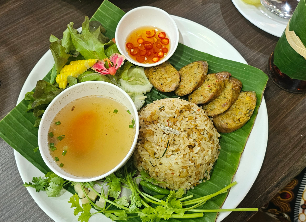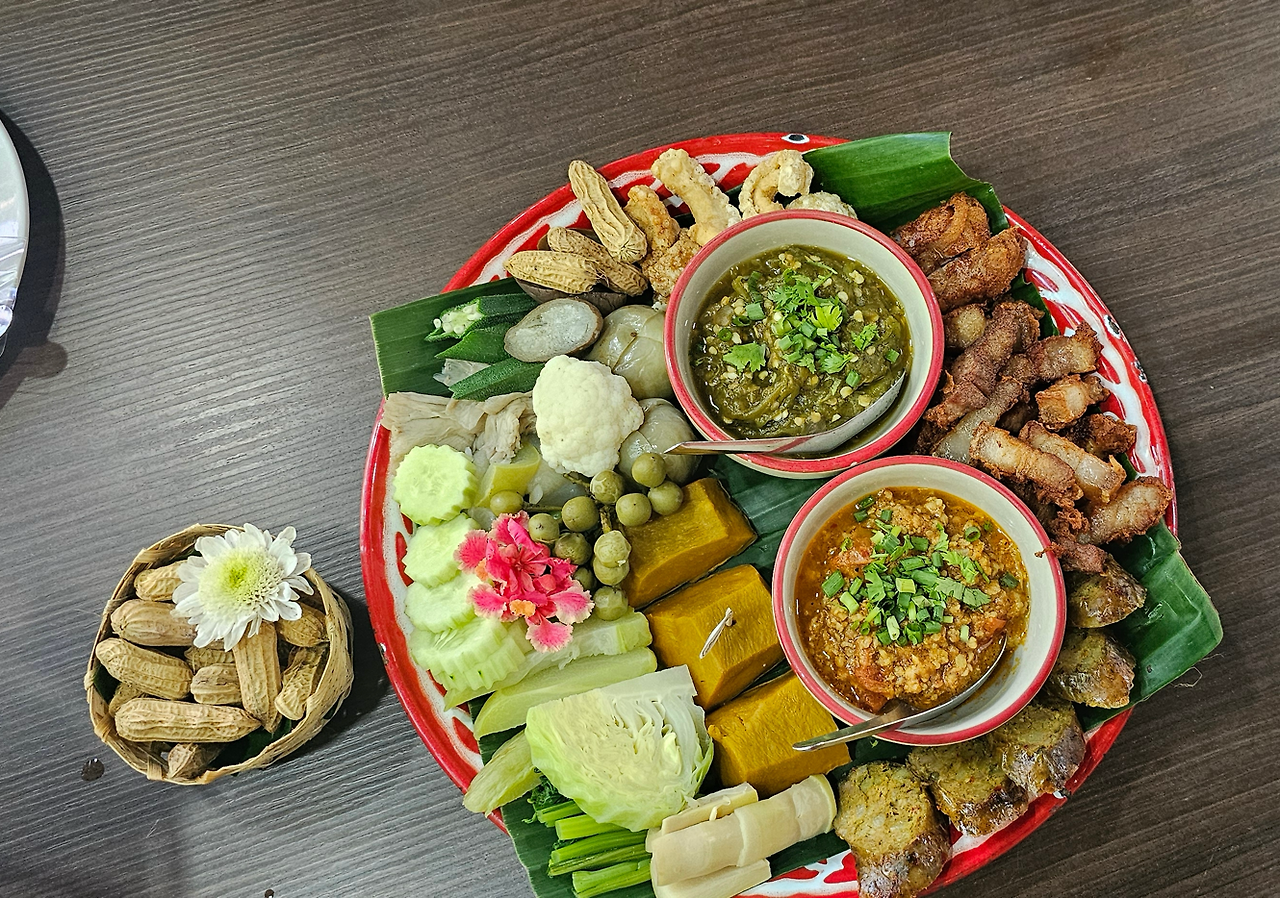 우리는 전통음식이 하나의 접시에 조금씩 나오는 플래터를 주문하고 각자 메뉴를 하나씩 더 주문했다. 치앙마이에 3년째 오지만 여전히 향신료에 거부감이 있는 K는 피자를 시켰다. 우리가 시킨 플래터는 ’란똑’이라고 불리는데 란나 푸드가 한 상으로 나왔다. 소반 위에 찹쌀밥과 여러 가지 채소와 반찬을 올린 북부 전통음식으로, 깽항래라는 북부카레와 남쁘릭이라는 고추 소스를 올려 같이 먹는 음식이었다. 싸이우아라는 북부식 소시지까지, 모든 북부음식을 하나씩 맛볼 수 있어 좋았다.