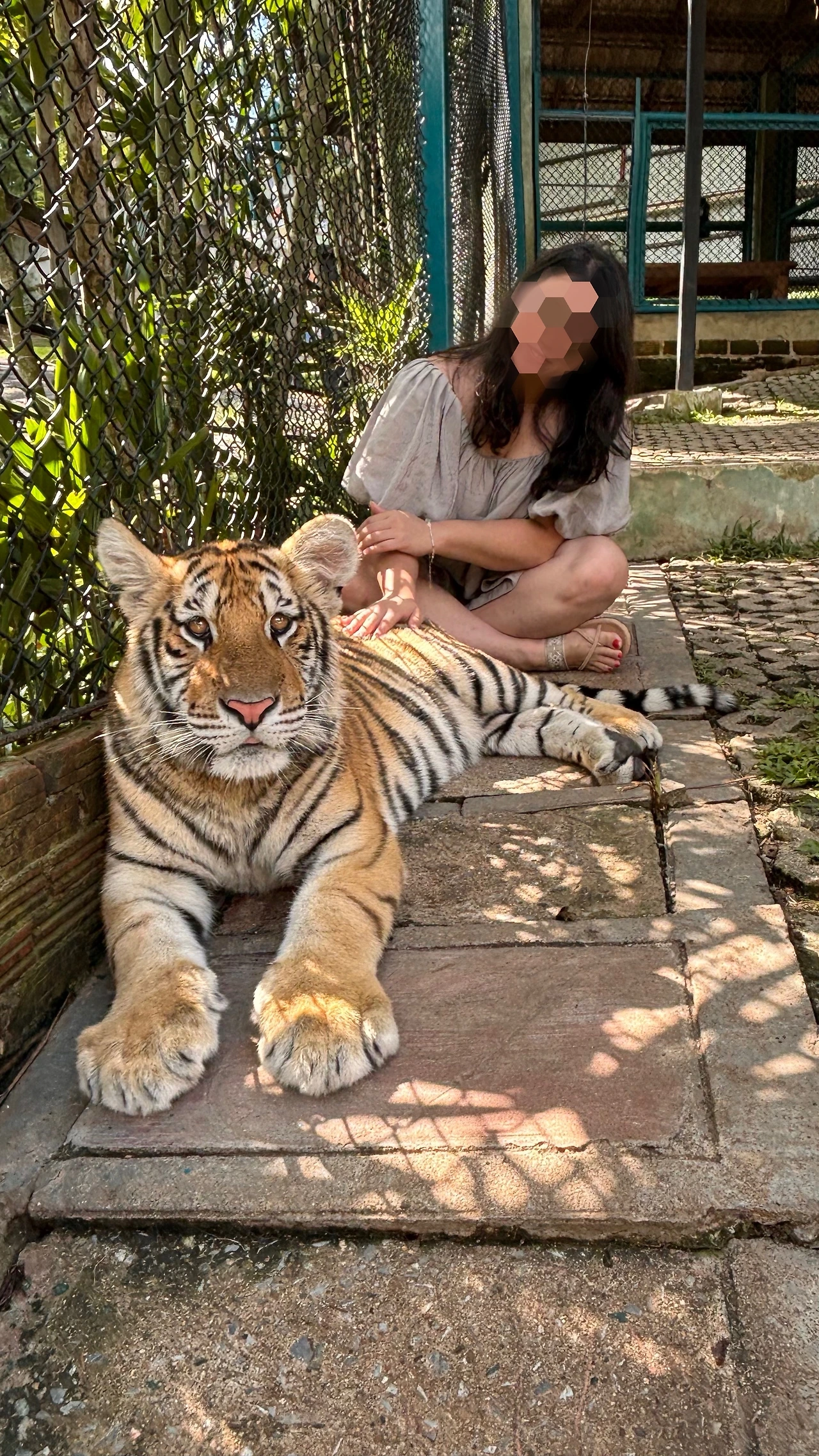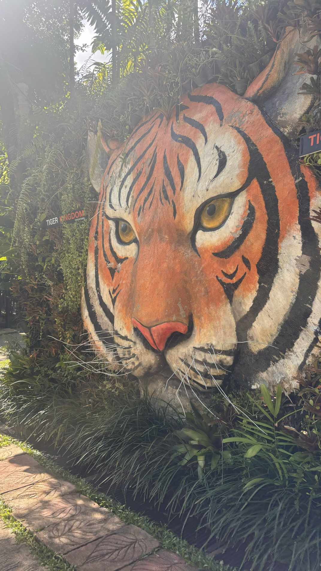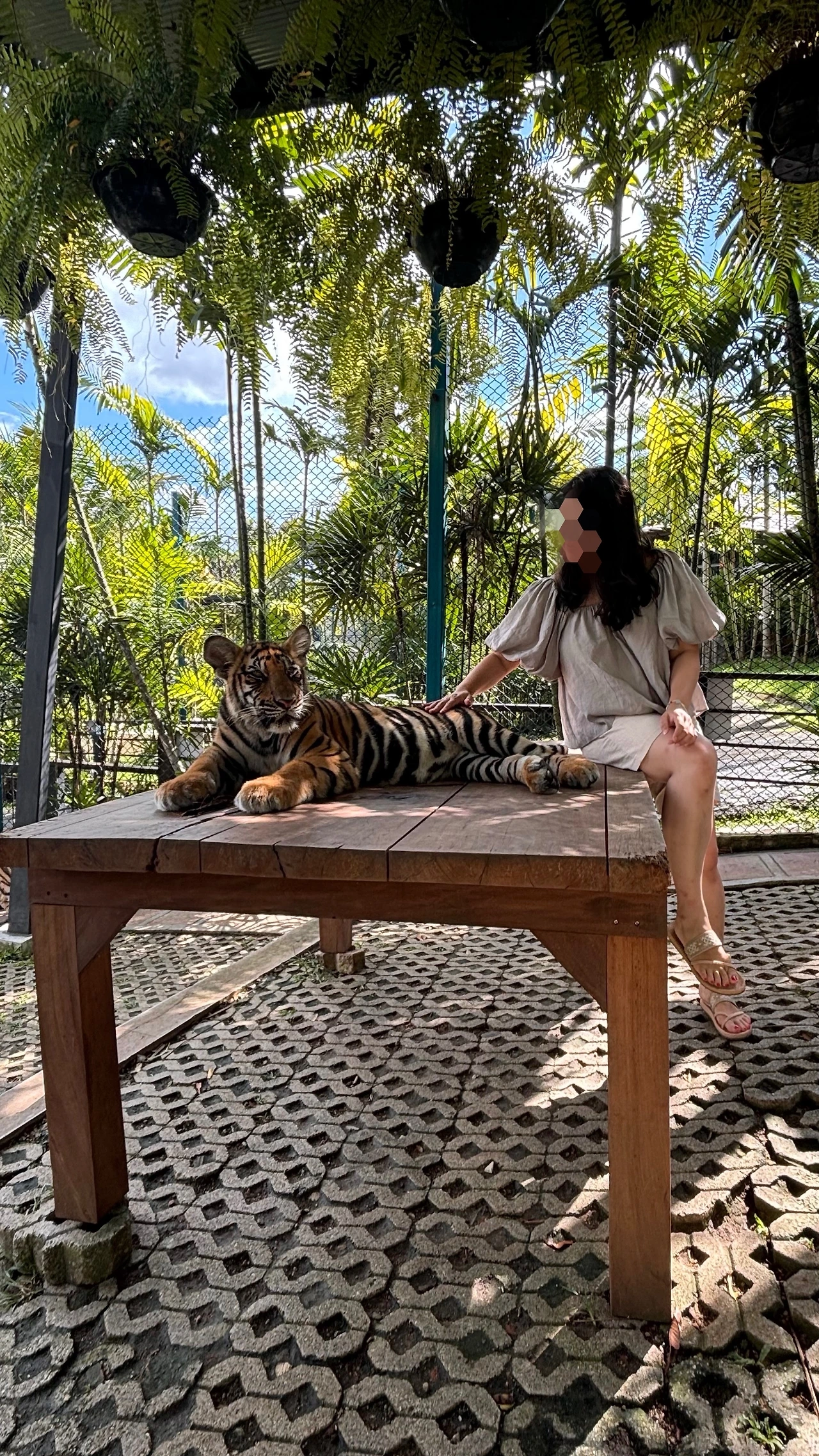 다음 코스는 바로 타이거 킹덤이었다. P형이 폭포 근처에 있다며 꼭 가보고 싶다고 코스에 추가한 곳이었다. 이름처럼 호랑이 왕국으로, 다양한 호랑이를 만나볼 수 있는 곳이었다. 입장권이 특이했는데 다양한 호랑이를 사이즈별로 패키지화하여 판매하고 있었다. 자이언트 호랑이 패키지를 구입하면 자이언트 호랑이 우리에 들어가 호랑이를 만져보고 함께 사진을 찍을 수 있는 것이었다. 가장 비싼 패키지는 2개월짜리 아기 백호 패키지였다. 우리는 5개월 정도 되는 스몰 사이즈 호랑이를 만나보기로 했다. 사실 나는 들어가지 않으려고 했다. 고양이 만지는 것도 용기가 필요한 나인데 호랑이를 만질 수 있을까 싶어서였다. 물론 지난 투어에서 코끼리와 교감하기는 했지만 호랑이는 아주 다른 문제였다. 맹수 아닌가. 그런데 형님들은 자기들이 지켜준다며 여기까지 와서 안 보고 가면 아쉽지 않겠냐며 꼭 함께하기를 바랐다.