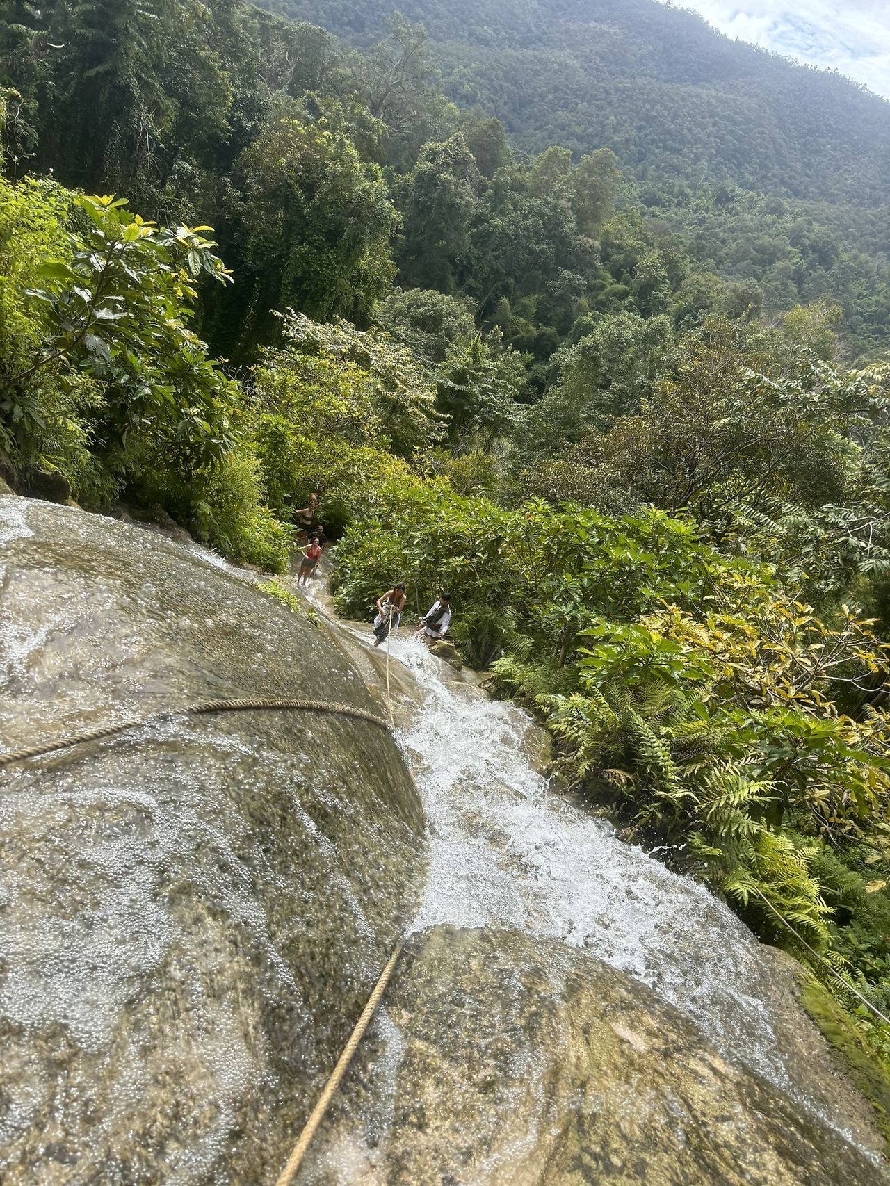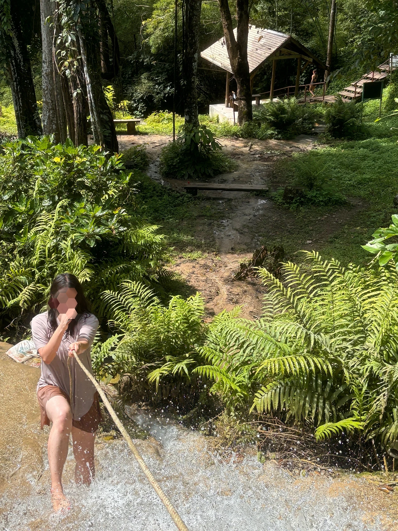 드디어 폭포 오르기에 돌입했다. 물은 계속해서 흐르고 내 발을 휘감는데 ‘끈적 폭포’ 답게 전혀 미끄럽지 않았다. 아이들도 잘 올라간다는 후기를 봤는데 상류지역 초입에서 한 아이가 아주 무서워하며 울먹이다가 포기하려 하고 있었다. 아까 계곡에서 만나 인사를 나눴었던 핀란드에서 온 가족이었다. 밧줄을 잡고 올라가야 하는 곳이다 보니 뒤에 사람들이 조금 밀려 있었다. 아버지는 아이를 보채거나 쉽사리 도와주지 않았고, 뒤에 있는 우리에게 계속해서 양해를 구했다. 우리는 괜찮다고 했고, 결국 그 아이는 시간은 오래 걸렸지만 혼자의 힘으로 정상에 올랐다. 언제 울었냐는 듯이, 해냈다는 뿌듯함이 가득 묻어나는 미소를 지었다. 짧은 시간이었지만 그 아버지로부터 기다림의 미덕과 아이로부터 자율성의 획득을 엿보았다. 현장에서 충분히 아이가 해낼 수 있는 일임에도 떠먹여 주려는(혹은 떠먹여 달라 부탁하는) 부모들을 많이 본 터라 더욱 생경한 풍경이었다.