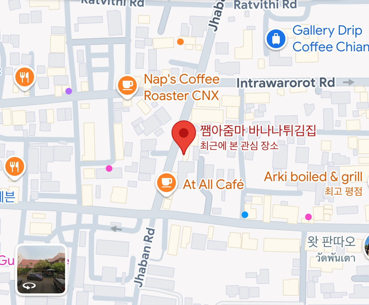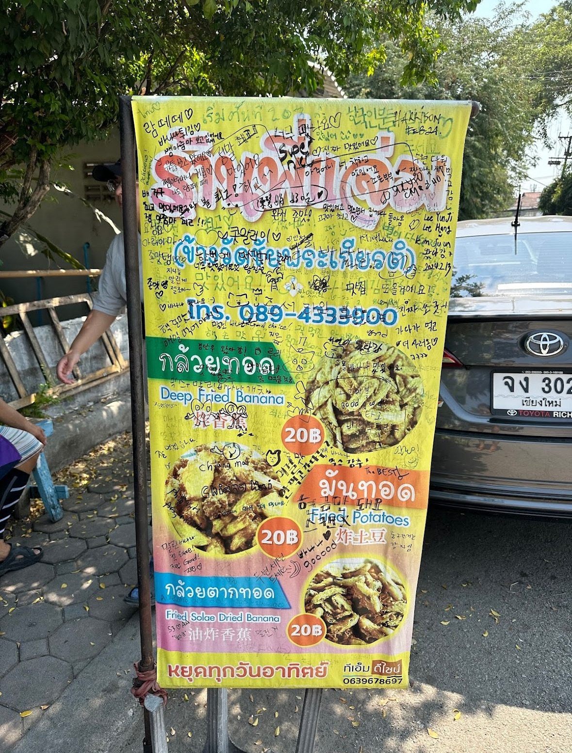 쨈아줌마의 바나나튀김 역시 여행자 커뮤니티에서 “아직 열려있나요?”를 물어보는 곳 중 하나이다. 바나나, 고구마 등을 즉석에서 튀겨서 파는 올드타운 안 조그마한 노점상인데 역시나 품절이 빨라 언제 문을 닫을지 모르는 곳이기 때문이다. 이곳의 주인 쨈 아주머니는 영어도 서투시고 태국어만 가능하시지만, 친절한 한국인 여행자들이 구글 지도에도 이 노점을 등록해 두고, 메뉴판까지 한국어로 만들어 두었다(실제로 구글맵에도 “쨈아줌마바나나튀김”이라고 뜬다). 길거리 간식이지만 깔끔하고, 튀김반죽의 간이 완벽해 바나나와 고구마의 달콤함이 더 극대화된다고 했다.