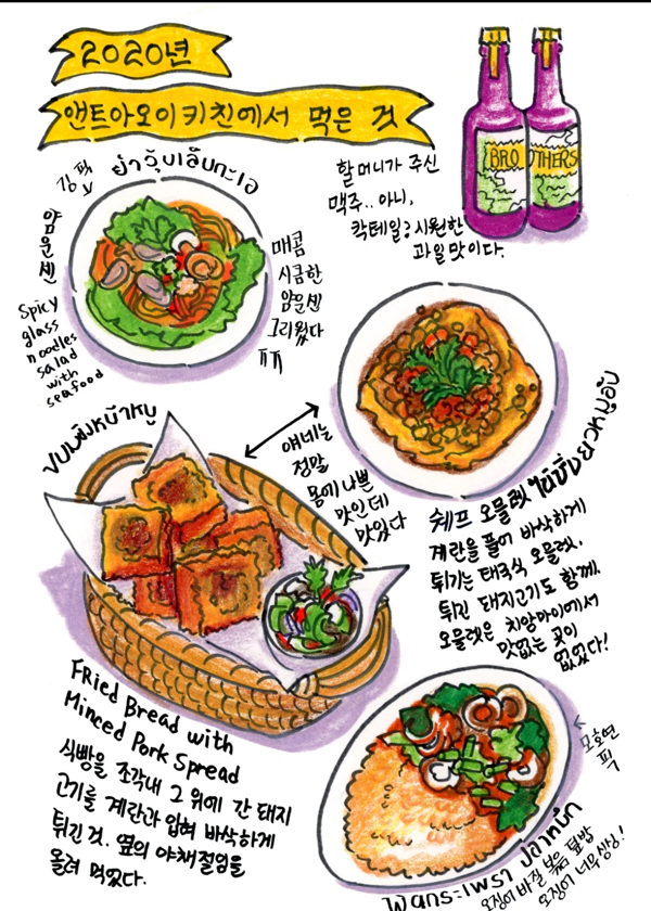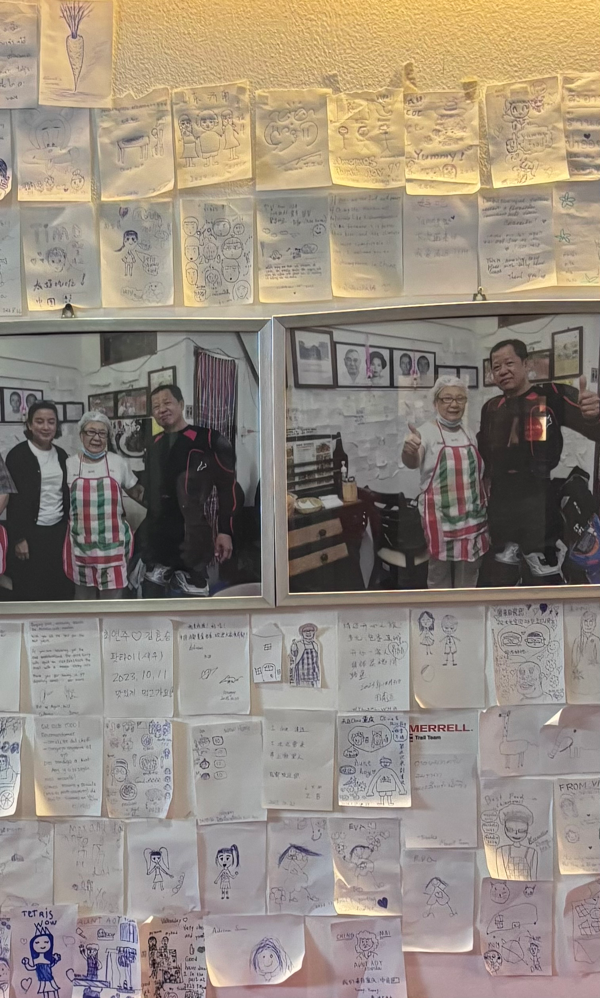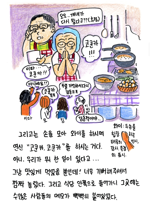 계산을 하며 벽면에 붙은 이다작가님의 사진을 가리키며 우리가 저분의 만화를 보고 찾아왔다고 이야기하자, 아오이 할머니는 “일부러 찾아와줘서 고마워. 다음에 꼭 또 와”하며 꼭 안아주셨다. 겨우 한 번 방문했을 뿐인데 다정하게 안아주시는 아오이 할머니 덕분에 부른 배와 더불어 마음까지 훈훈해져서 나왔다. 태국에도 할머니댁이 생긴 기분이었다.