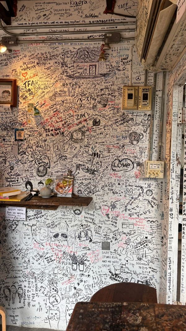 비록 4시간 문을 열고, 어떤 날은 그보다도 빨리 문을 닫지만 그 어떤 카페보다 회전율도 빨랐고, 테이크아웃 손님도 끊이지 않았다. 나는 “그는 워라밸 대장이어도 된다!!”라고 결론을 냈다. 물론 문을 닫고도 잔업이 이어진다고 했지만, 그렇게 해서 만든 커피를 맛있게 먹어주고 그의 매장 벽에 낙서 하나를 더하는 손님들이 그에게 힘을 불어넣어주지 않을까.