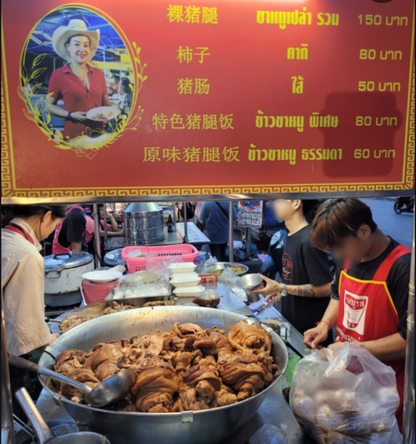 카우보이 족발덮밥 여왕은 창푸악 야시장에서 아주 유명한 분이다. 카오카무라고 불리는 태국의 족발덮밥은 한약재를 넣고 오래 끓여 야들야들한 족발을 밥에 얹어 먹는 요리이다. 한국인들에게는 아주 익숙한 맛인지라 여행자들에게 인기가 많은 메뉴이기도 하다. 사장님이 늘 카우보이 모자를 쓰고 화장을 곱게 하셔서 카우보이 족발덮밥의 여왕이란 별칭이 붙었다고 한다. 이 여왕님은 야시장의 명물이라 이 집 앞에는 늘 줄이 길었다. 나는 여왕님을 직접 영접하지는 못했다. 아쉬운 대로 간판 속 여왕님의 모습만 카메라에 담아보았다. 자리가 없어 포장해서 숙소에 와서 먹었는데 식었는데도 불구하고 야들야들한 족발의 식감이 살아 있었다.