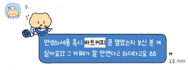 단기 여행자든, 장기 여행자든 한 번은 지나치거나 방문해 보았을 바트커피는 ‘더티커피’ 맛집으로 세 손가락 안에 꼽히는 곳이다. 그런데 이곳 사장님은 왜 워라밸 대장이라는 별칭을 얻게 되었을까? 일단 구글지도에서 확인한 영업시간은 10:30-14:30이지만, 문 열고 닫는 요일이나 시간이 주인 마음대로라는 후기가 엄청나게 많았다. 여행자 단톡방에는 매일아침 “바트커피 열었나요?”라고 확인하는 메시지가 올라올 정도였다. 가뜩이나 하루 4시간 영업인데 그조차도 달라질 수 있다고? 워라밸 대장이 분명했다.