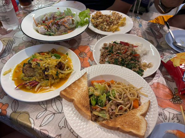 그 책 덕분에 나는 아오이 할머니가 만든 음식이 먹어보고 싶어졌고, 그녀의 정을 조금이나마 느껴보고 싶었다. 메뉴판 속 모든 메뉴가 먹어보고 싶어서 폭포 트레킹 투어를 함께한 동행들과 같이 방문했다. 우리는 네 명이었지만 튀긴 돼지고기가 듬뿍 올라간 태국식 오믈렛, 당면으로 만드는 상큼한 태국식 샐러드 얌운센, 돼지고기 덮밥 팟카오팟 무쌉, 이다 작가님의 최애 메뉴라는 토마토 스파게티, 튀긴 게가 들어간 뿌빳뽕 커리 이렇게 다섯 가지 메뉴를 시켰다. 근데 정말 모든 메뉴가 다 맛있었다! 나는 얌운센과 뿌빳퐁 커리가 최고였고, 일행들은 각각 다른 메뉴를 1등으로 뽑았을 만큼 모든 메뉴가 다 기본이상으로 맛있었다. 여행 막바지에 이 식당을 알게 된 것이 아쉬울 따름이었다.