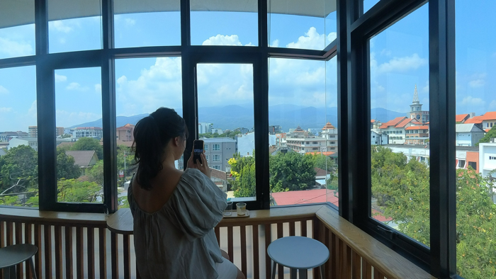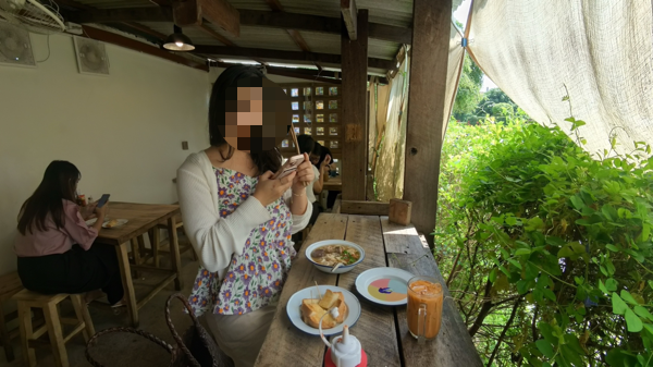 분위기: 햇살 가득한 테라스, 손님이 끊이지 않음, 치앙마이 대학생들에게도 인기