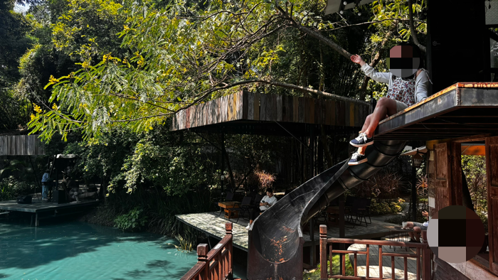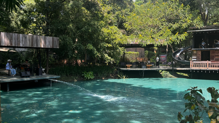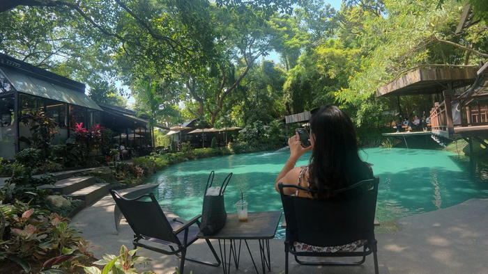 나의 경험: 치앙마이에 여행을 온다면 이 카페는 꼭 방문한다고 보면 된다. 마치 물감을 탄 것 같은 색의 연못이 이국적인 데다, 연못을 둘러싼 야외좌석에서 초록초록한 나무들, 쏟아지는 햇볕을 느낄 수 있는 곳이기 때문이다. 또 트리하우스가 남아있어 포토존으로도 손색이 없다. 연못 위의 야외무대에서는 매일 버스킹 공연이 열린다. 내가 갔을 때는 여성 듀오의 버스킹 공연이 이뤄지고 있었다. 중국인 부부가 사진을 요청해 찍어준 뒤로 함께 이야기도 나누고, 내 사진도 남길 수 있었다. 의자에 앉아 연못 물도 바라보고 초록초록한 풍경에 멍 때리고 있다 보면 시간이 훌쩍 간다(모기가 많아 기피제는 필수!)