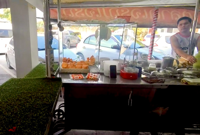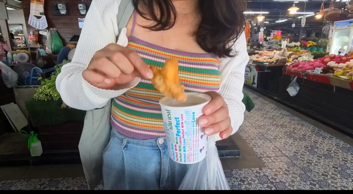 그렇게 나의 새는 바가지를 처음 보는 사람들에게도 보여주고 난 뒤에는 시장을 구경할 수 있는 짧은 자유시간이 주어졌다. 여행 3주 차에 클래스를 듣다 보니 이미 여러 시장을 경험한 터라 크게 새로울 것은 없었지만 설명을 듣고 나니 재료가 하나하나 더 잘 보이는 것이 신기했다. 또, 워낙에 쿠킹클래스에서 자주 들르는 마켓인지라 요리를 만들 때 필요한 재료들을 소분해서 패키지로 판매하고 있는 것도 신기했다. 마트에서 보는 것처럼 포장이 화려한 패키지는 아니고 재료가 있는 그대로 들여다보이는 지퍼백에 조금씩 소분해 1-2인분 요리할 수 있도록 만들어 둔 것이었다. 그리고 참가자들과 함께 과일을 사서 서로 조금씩 나눠먹기도 하며 즐겁게 시장을 둘러봤다. 마침 이 시장에 빠똥꼬를 파는 가게가 있었다. 빠통고(빠떵꼬)는 치앙마이 사람들이 아침식사로 즐겨 먹는 꽈배기로 따뜻한 두유에 찍어 먹기도 하는 음식이다. 홍콩이나 대만에서 먹는 요우티아오와도 비슷한 생김새다. 나는 빠통고 한 컵과 따뜻하고 달지 않은 두유 한 컵을 주문해 찍어먹어 보았다. 달지 않고 담백하면서도 든든한 식사가 되었다. 분명 그랜마즈홈 쿠킹클래스는 빈 속으로 가야 한다는 후기를 봤는데 시장에서 유혹에 넘어가버렸다.
