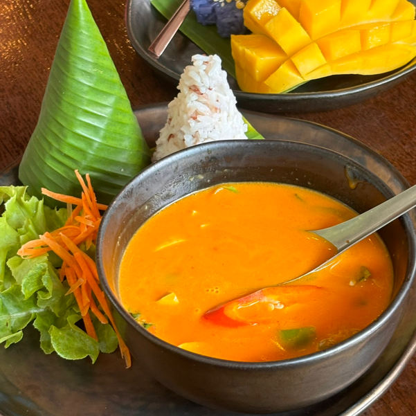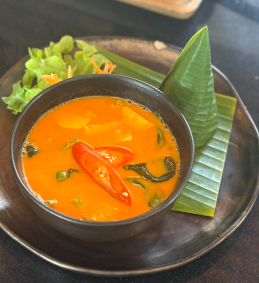 레드 커리는 보통 닭고기나 돼지고기와 함께 요리되지만, 야채만 넣어도 충분히 깊은 맛이 났다. 밥이 함께 제공되어 곁들여 먹었다.