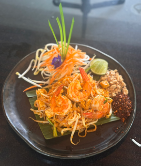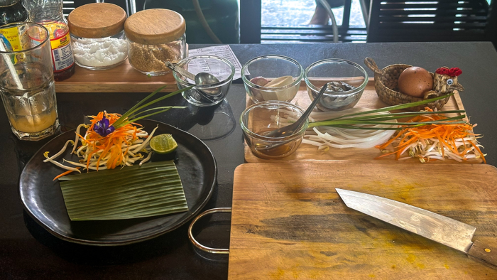 가장 배우고 싶은 요리이자 태국 여행에서 가장 많이 먹었던 요리 중 하나가 바로 팟타이였다. 직접 만들어보는 경험은 색다른 즐거움이었다. 달걀이 필수로 들어가는 요리라 일단 세팅부터가 너무 귀여웠다. 나는 새우가 들어가는 팟타이인 팟타이 꿍을 만들어 보았다. 팟타이는 토피가 시연을 보여줘 열심히 본 후 그대로 따라 했다.