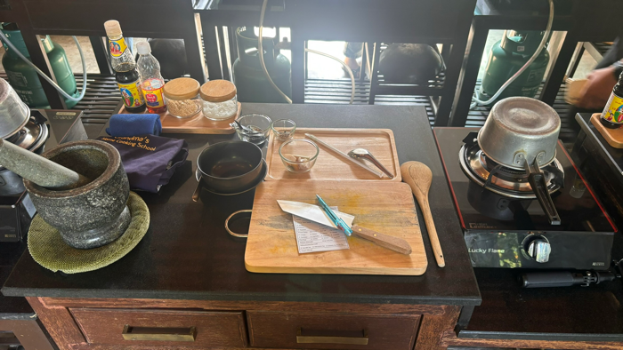 총 세 가지의 메인 메뉴를 만드는 데 수프와 커리메뉴는 각자 메뉴를 선택할 수 있었다. 팟타이는 기본으로 코스에 들어가고, 망고 스티키 라이스는 디저트로 포함되어 있었다. 나는 치킨이 들어간 코코넛 수프, 베지테리언 레드 커리, 그리고 새우 팟타이를 만들기로 했다. 각자의 자리에는 도마와 칼, 절구, 가스버너와 냄비, 앞치마가 세팅되어 있었고 각 요리가 진행될 때마다 필요한 재료는 그때 그때 세팅해 주는 시스템이었다. 강사는 기본적인 재료 설명과 레시피는 동일하게 알려주되 “각자의 스타일대로 요리하면 돼요. 태국 요리는 유연하답니다!”라며 자유롭게 조리할 수 있도록 도와주었다. 내가 배운 대로 각각의 레시피를 소개해보자면 다음과 같다.