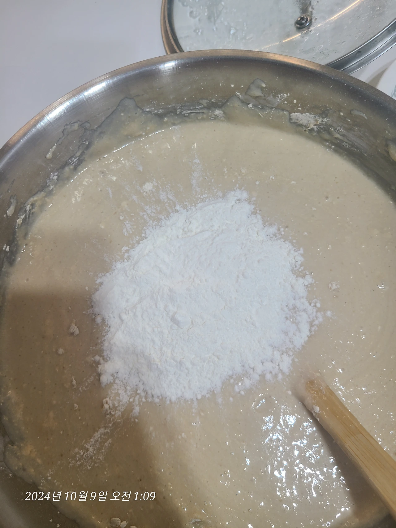 끓이고 있는 2L의 물에 풀어둔 쌀가루를 넣고 약불에서 죽을 쑨다.