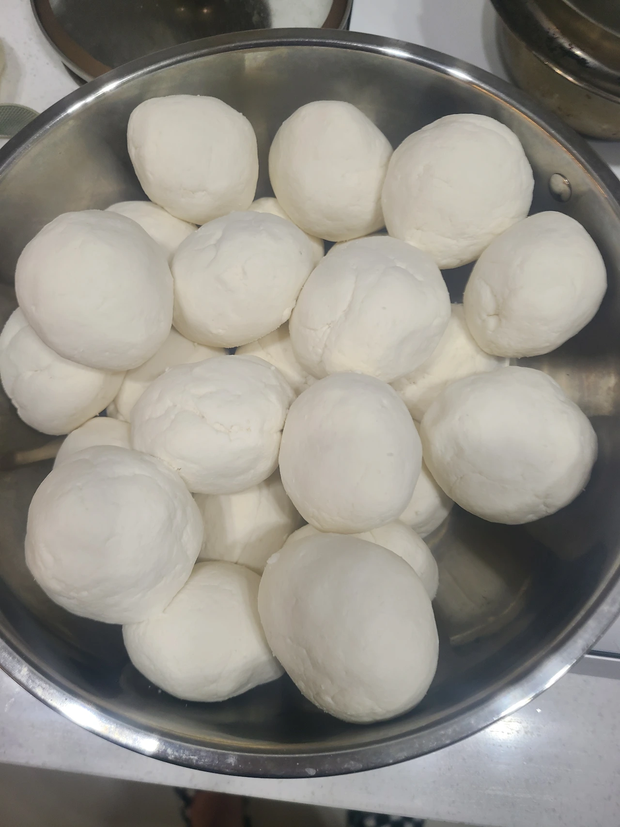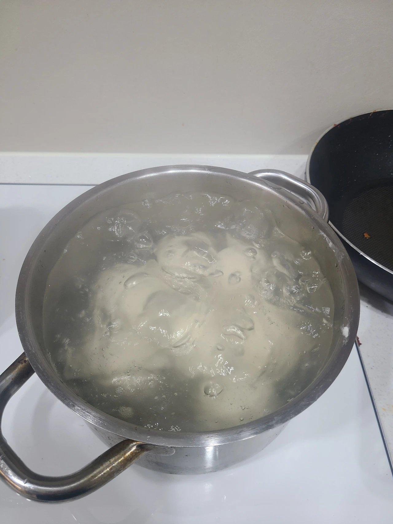 덩어리들을 끓는 물에 넣고, 완전히 익지 않은 상태(2/3정도)에서 건진다. 반죽이 물에 뜨면 익은 것이다.