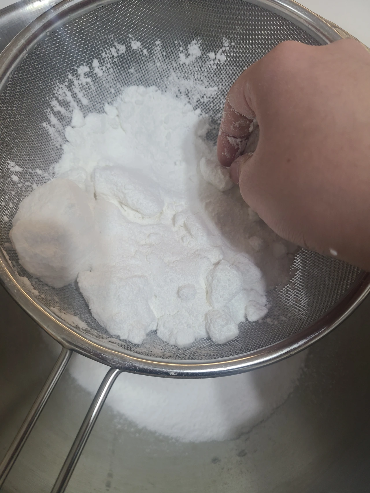 멥쌀가루(1.5kg)와 밀가루(300g)를 체에 곱게 내려 섞어준다.
