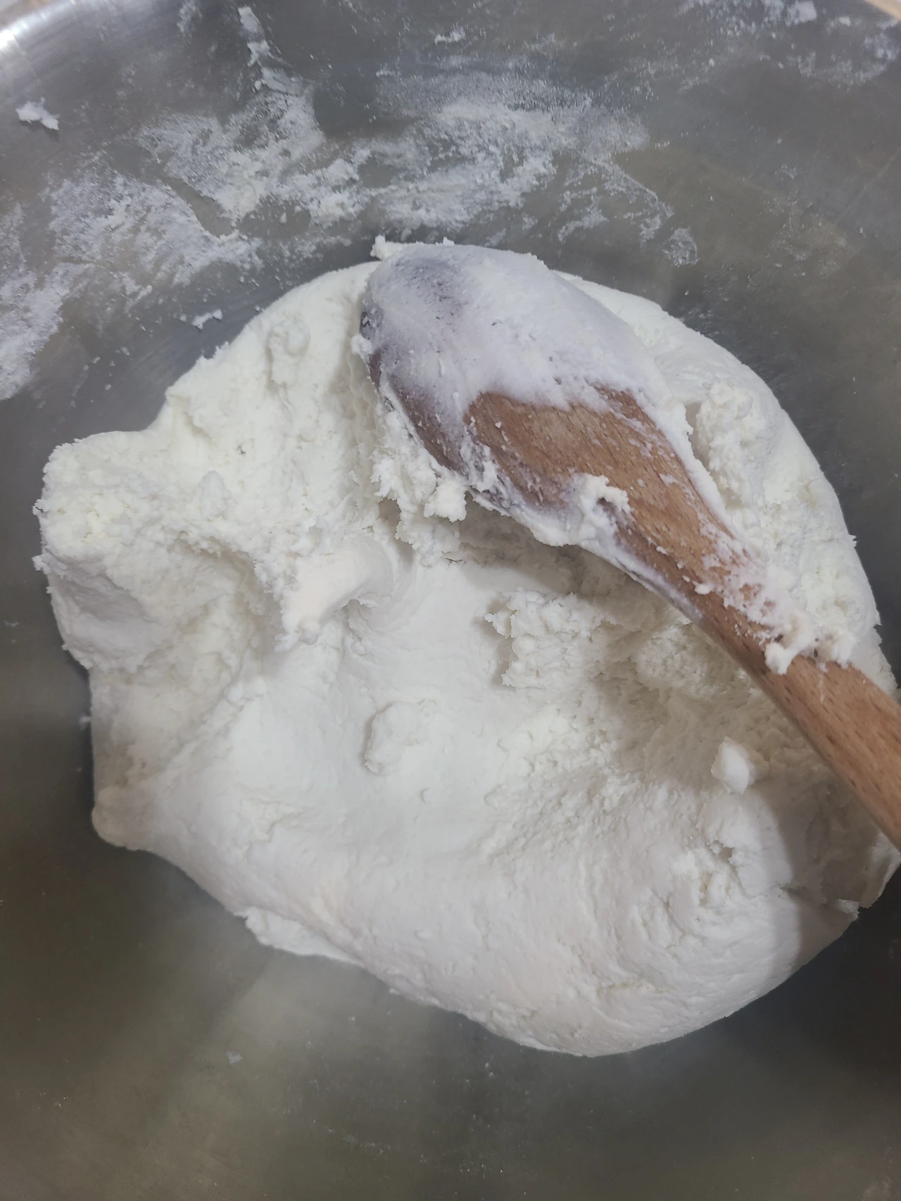 끓는 물(1L)을 조금씩 부어가며 익반죽을 해 여러 덩어리로 만든다.