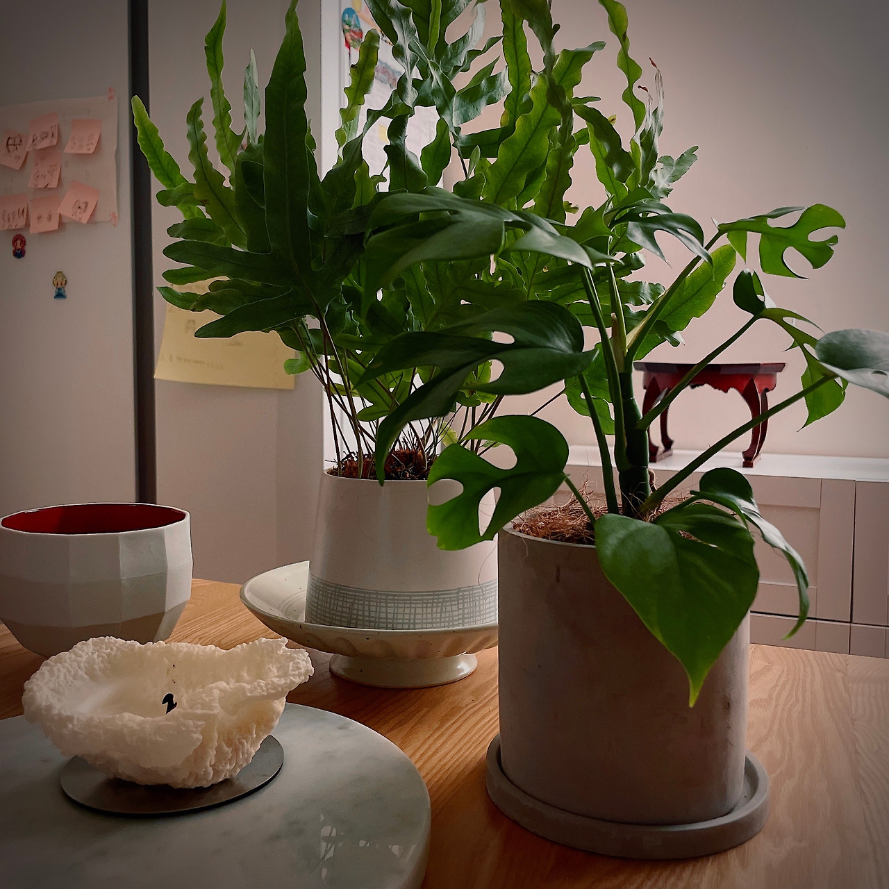 계속 집안에 머물러야 하고 주방에 있는 시간이 많아지면서 눈길 닿는 곳에 초록을 보고 싶어서 테라스에 있던 화분 몇 개를 식탁 위로 가져왔다. 일교차가 심한 테라스에 있다가 따뜻한 실내로 들어오니 잎이 그새 무성해졌다.