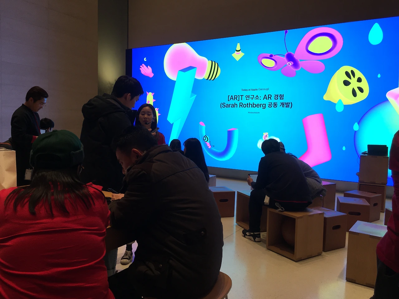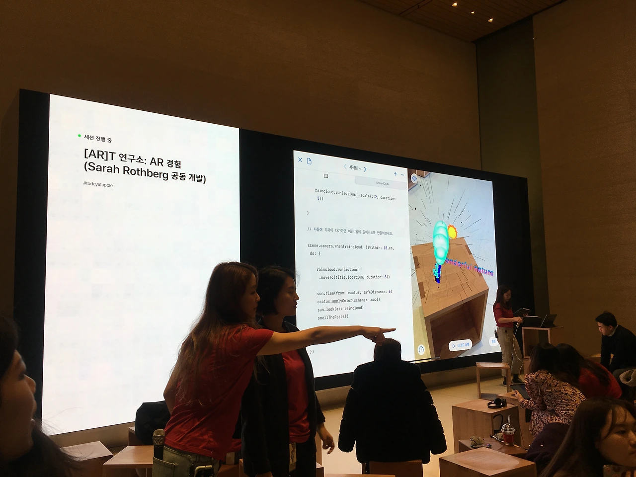 Today at Apple 은 매일/정기적으로 열리는 애플 앱 튜토리얼 세션 같은 것이다. 미리 홈페이지로 자리를 예약해야되며, 공석이 있으면 현장에서 참여 신청을 할 수도 있다. 코딩, 포토샵, 영상, 키노트 등 여러가지 컨텐츠를 다루는 앱을 가르치기도 하고, 흥미로운 주제들을 가지고 진행하기도 한다. 내가 초대받은 세션은 keynote로 앱 프로토타입을 만드는 것이었다. 그와 동시에 옆에 있는 더 큰 led wall 에서는 AR 증강현실과 관련된 앱 세션이 진행되고 있었다.