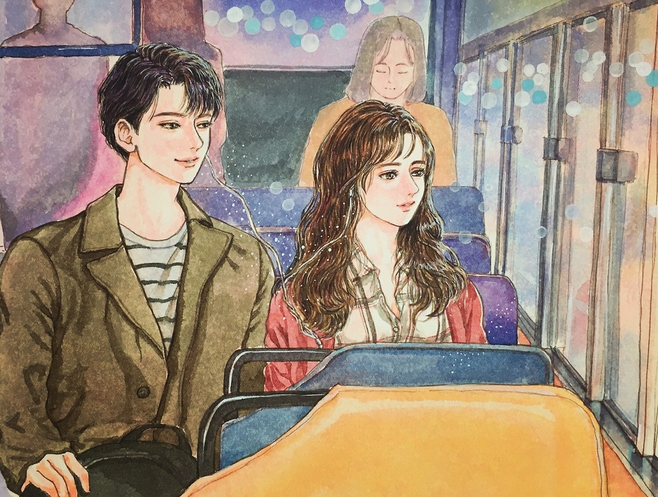 #수채화 #연인 #커플 #데이트 #손그림 #수작업 #그리움 # 회상 #추억 #버스데이트 #버스에서 #그림 #일러스트 #가을