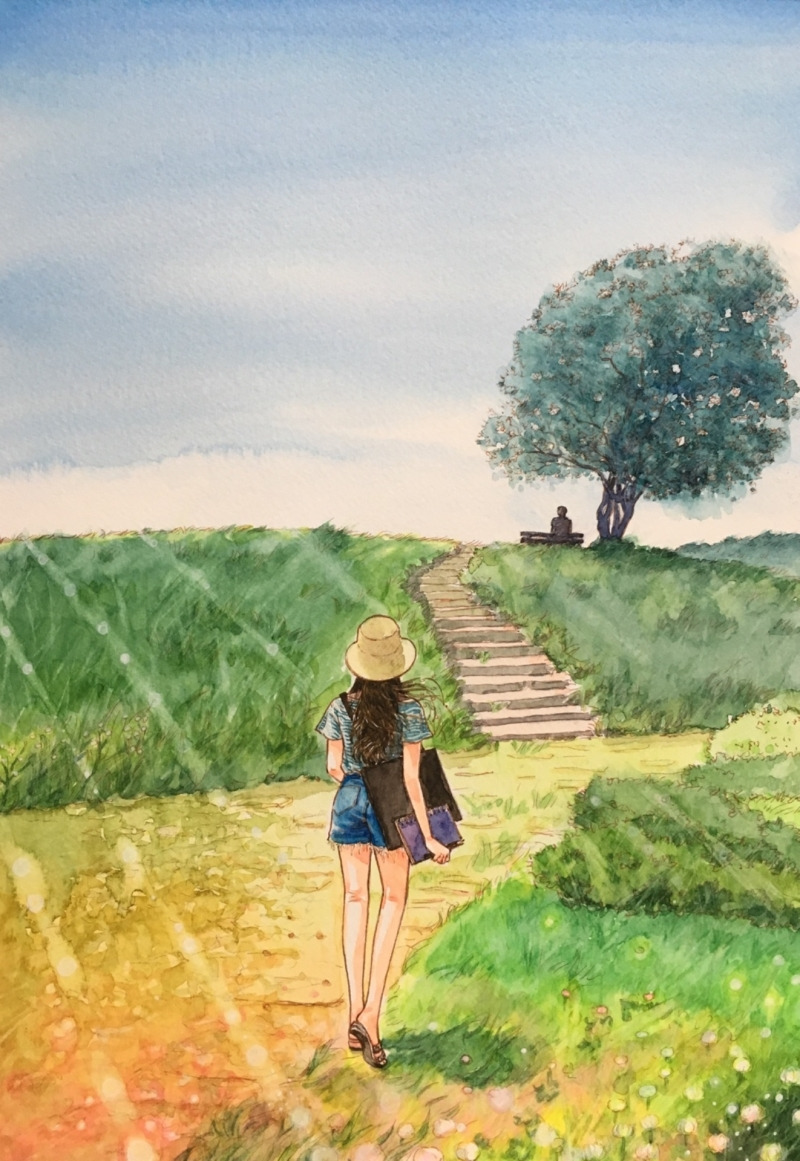 #수채화#여름#나무#벤치#연인#사랑#연애#회상#추억#그리움#쓸쓸함#고독#행복#일상#에세이#그림#일러스트#수작업#손그림#뒷모습#시