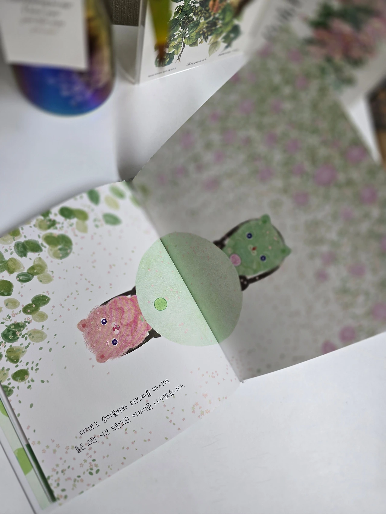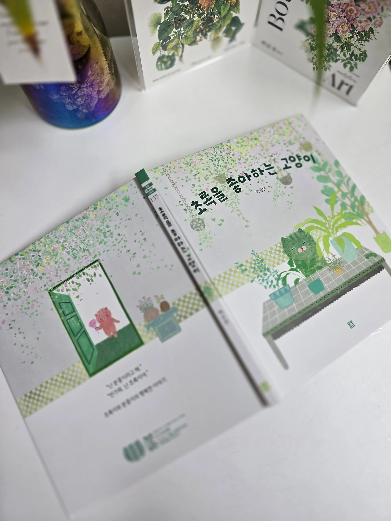 처음 페이지에서 초록 고양이가 분홍 꽃에 물을 주는 장면은