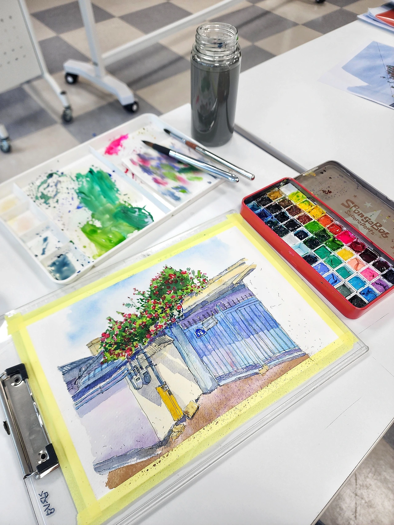캔버스를 놓고 팔레트를 놓고 물감을 놓고 물통과 티슈를 놓으면 채색 준비 완료다.