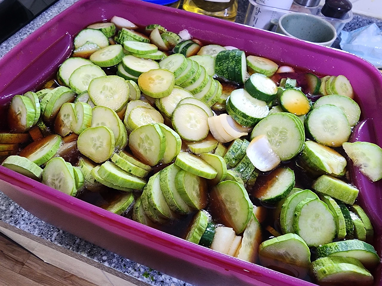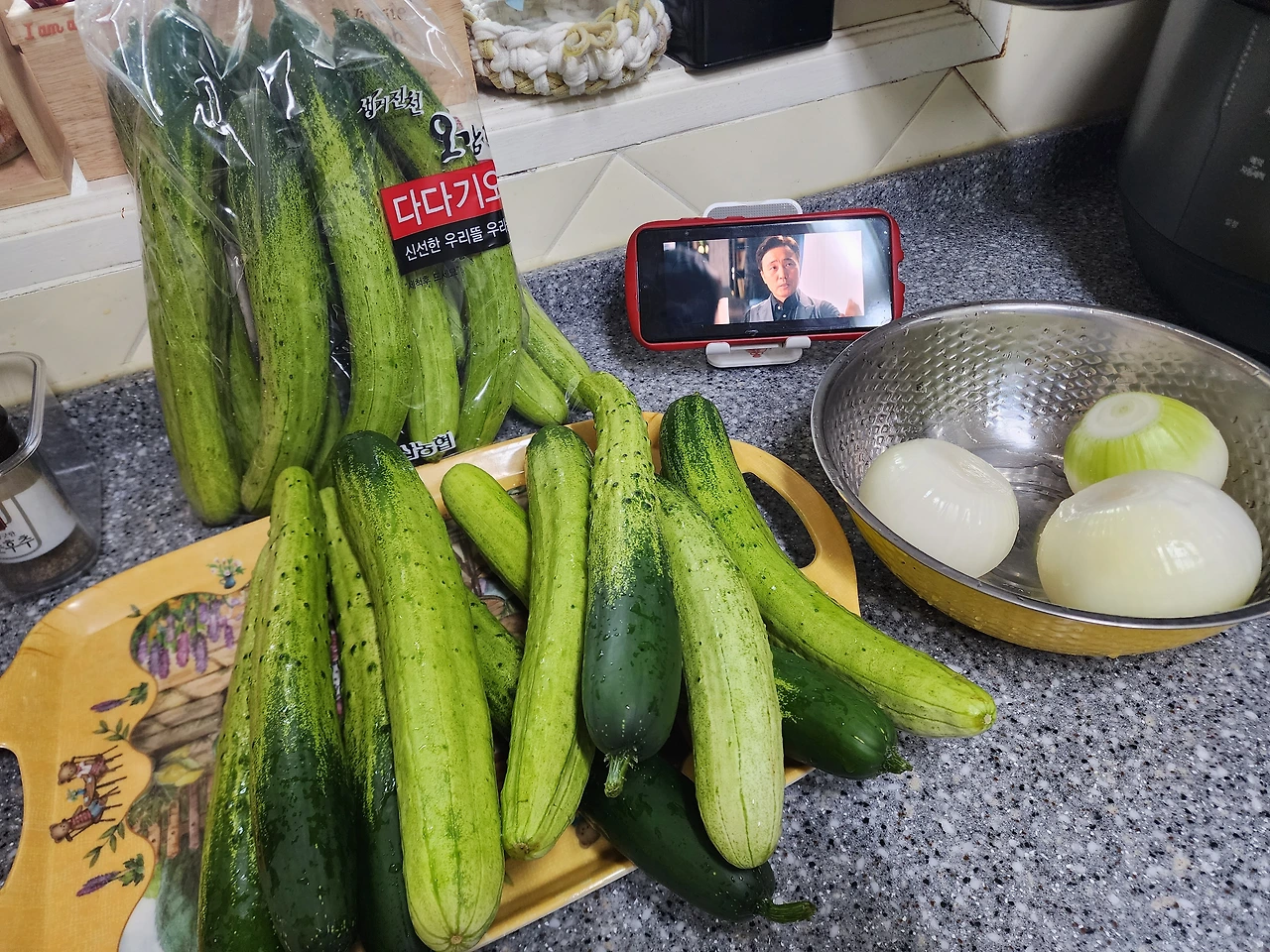 오이랑 양파를 깨끗이 씻어 물기를 닦고