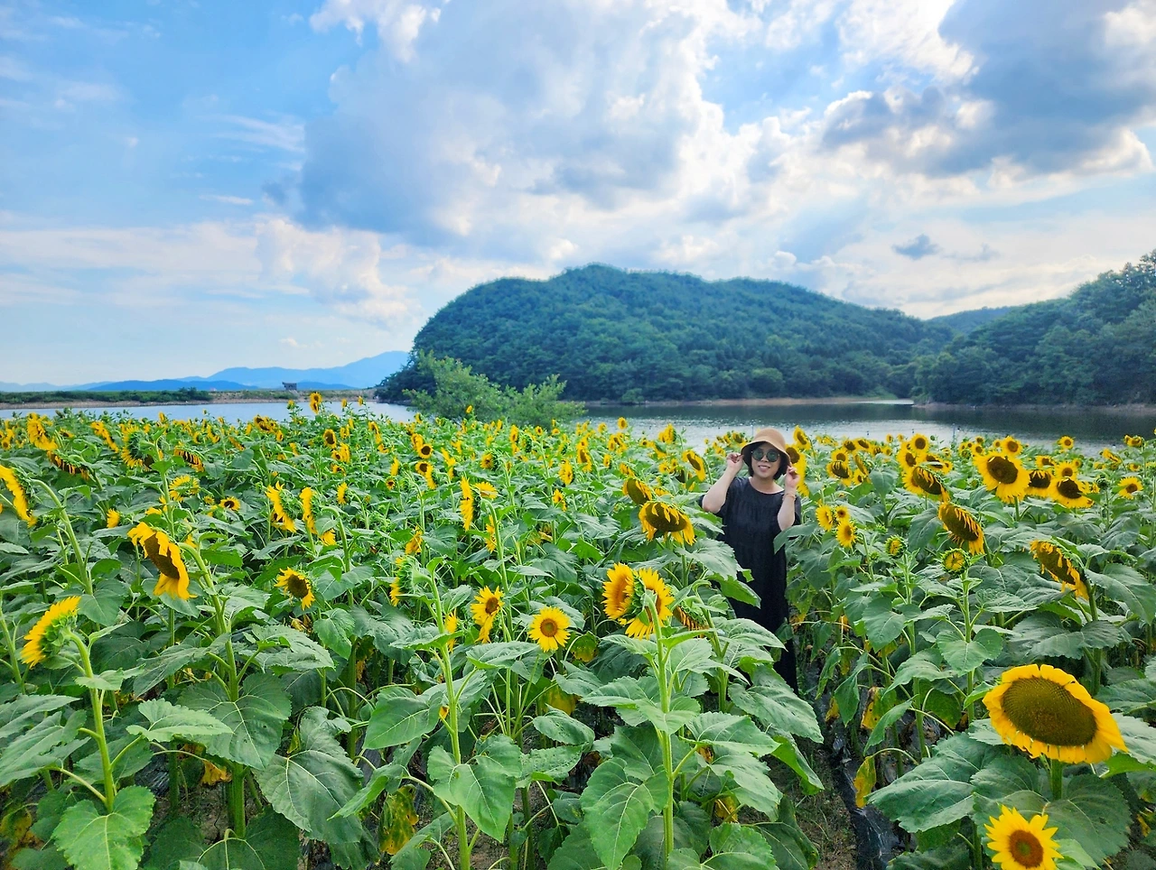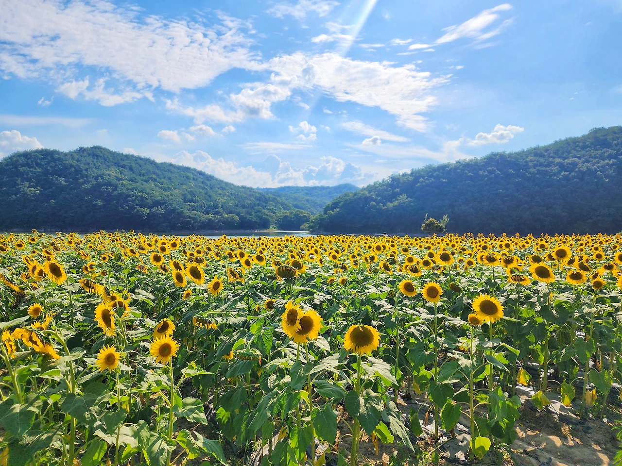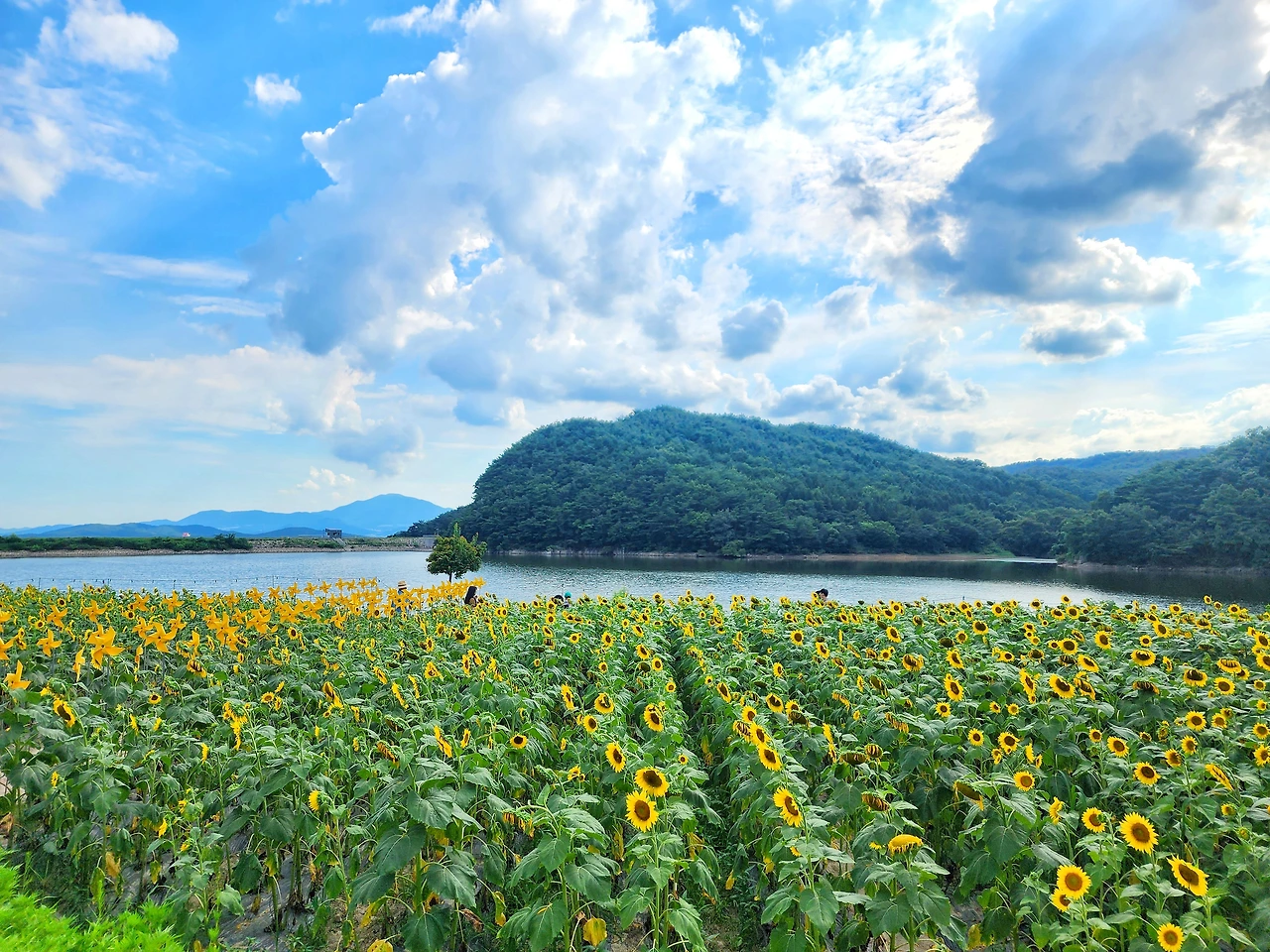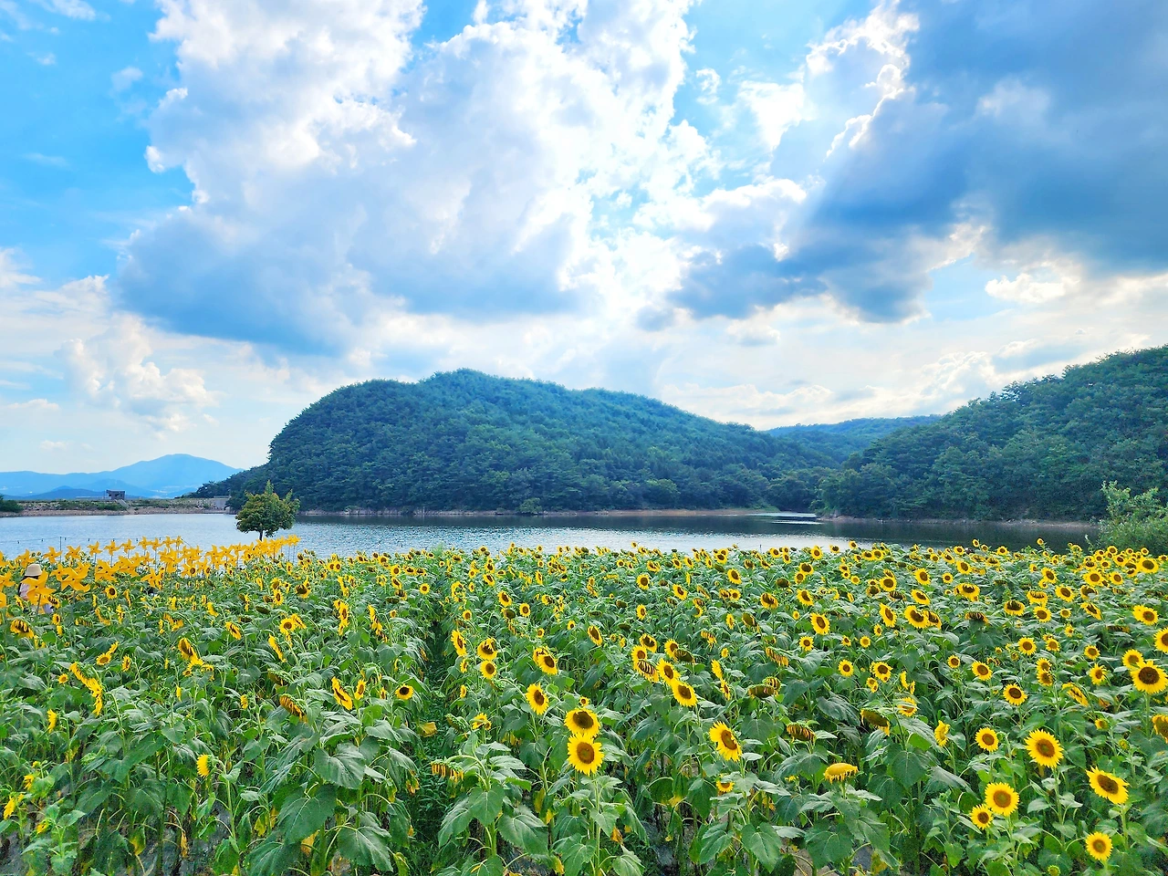 이곳은 하늘과 산, 그리고 저수지와 해바라기가 만들어낸 풍경은 정말 예술이다.