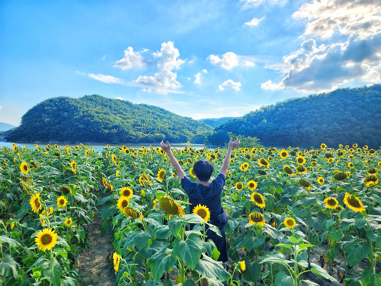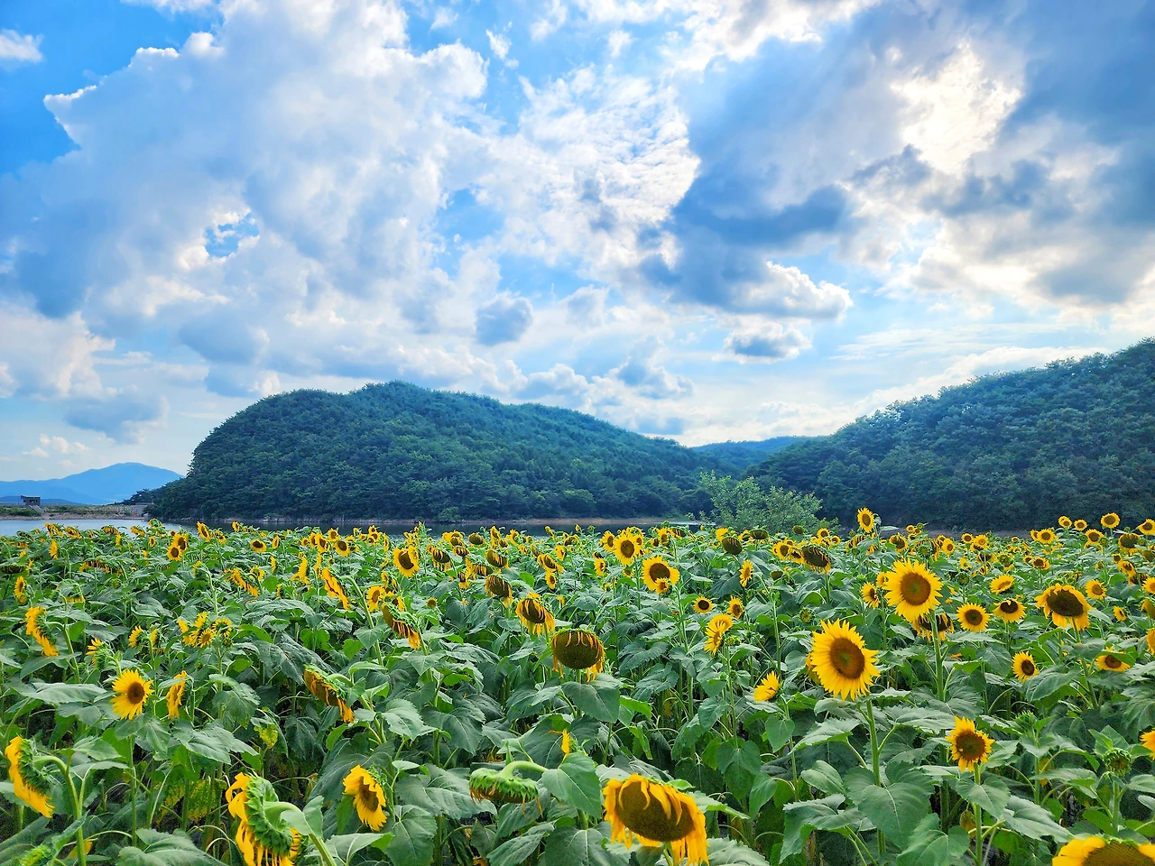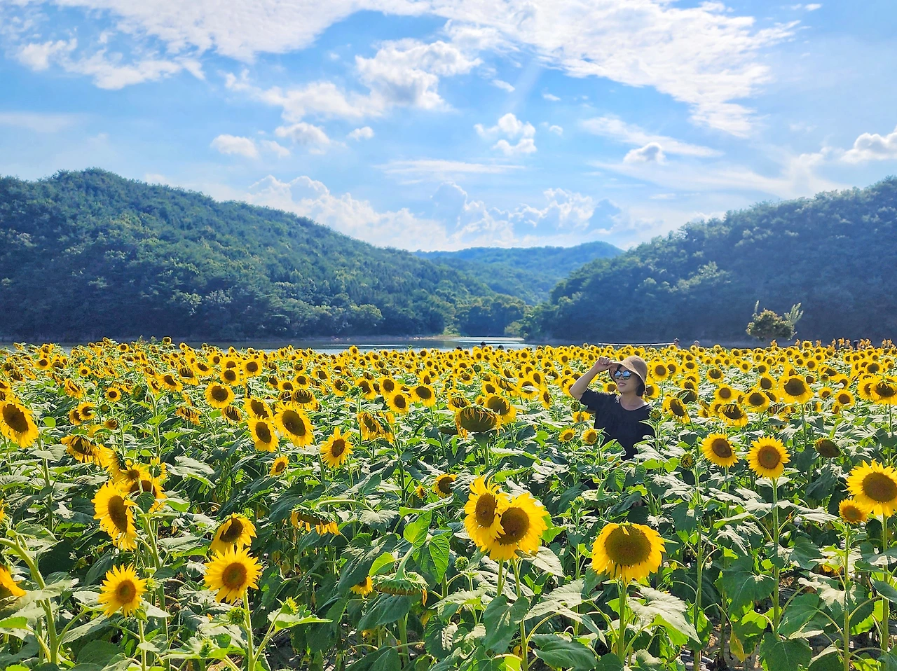 이곳은 하늘과 산, 그리고 저수지와 해바라기가 만들어낸 풍경은 정말 예술이다.