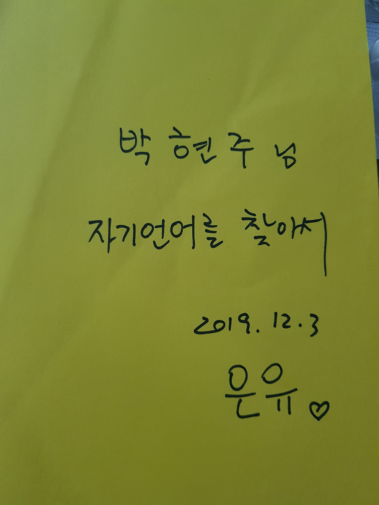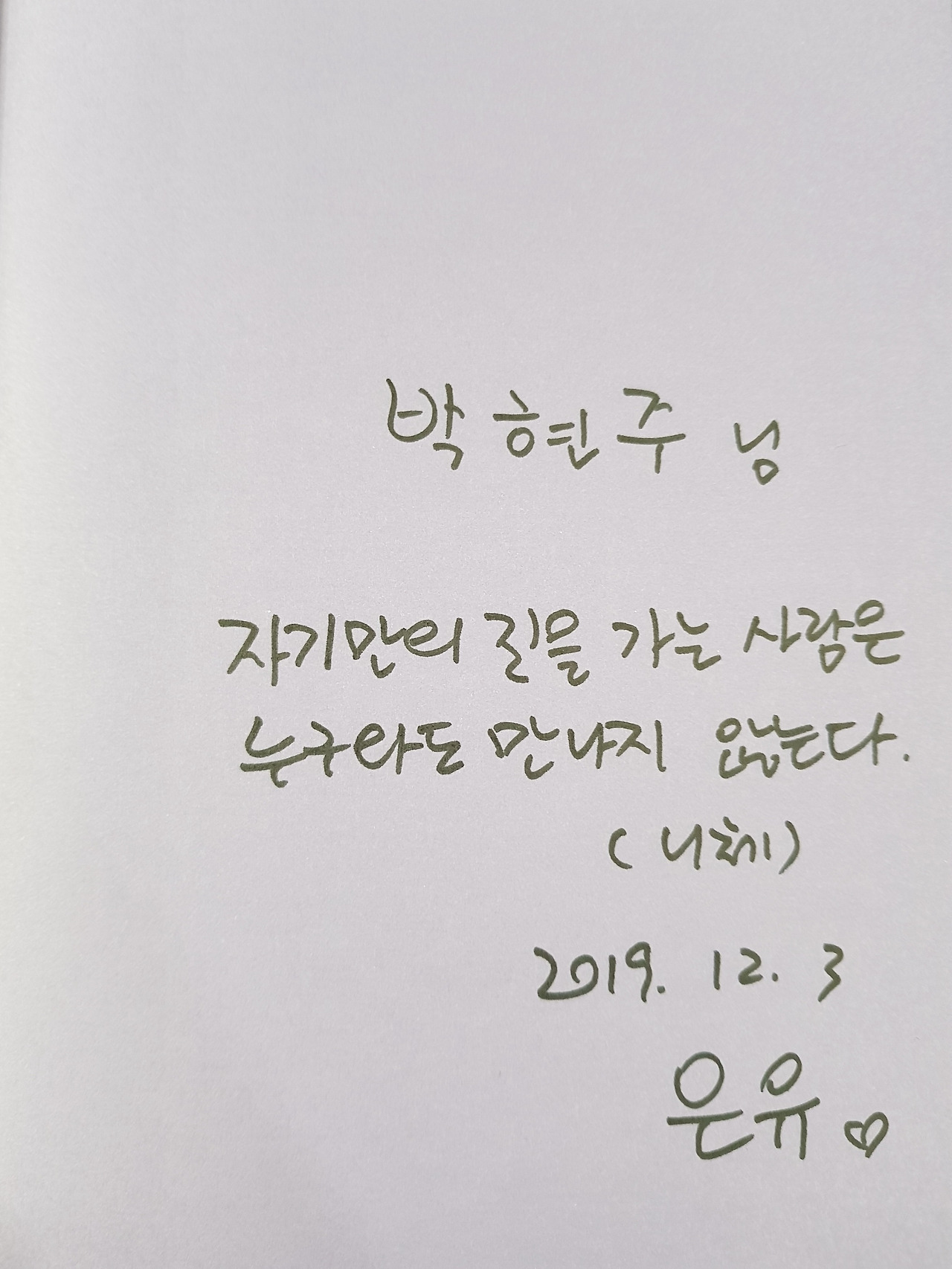 강당에서 내려와 핸드폰을 보니 신랑에게서 카톡이 와있었다. 나 애들이랑 데리러 갈게. 다시 현실로 돌아갈 시간. 육아에 치이고, 시간에 치이고, 아픔에 치이더라도 잘 이겨내자며 작가님 사인 아래 적힌 메모를 다시 읽는다. ‘박현주 님 자기만의 길을 가는 사람은 누구와도 만나지 않는다. (니체)’ 마음을 단단히 먹으며 강연장을 나섰다.