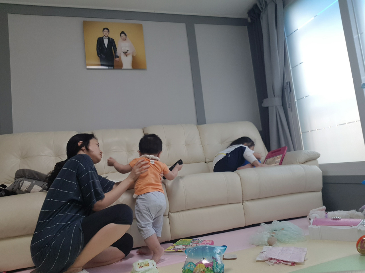 하원한 첫째는 소파에서, 식탁에서, 거실 바닥에서 태블릿을 보고 한쪽에서 엄마는 둘째를 돌보는 게 신랑이 귀가하기 전까지의 일상으로 자리를 잡았다.