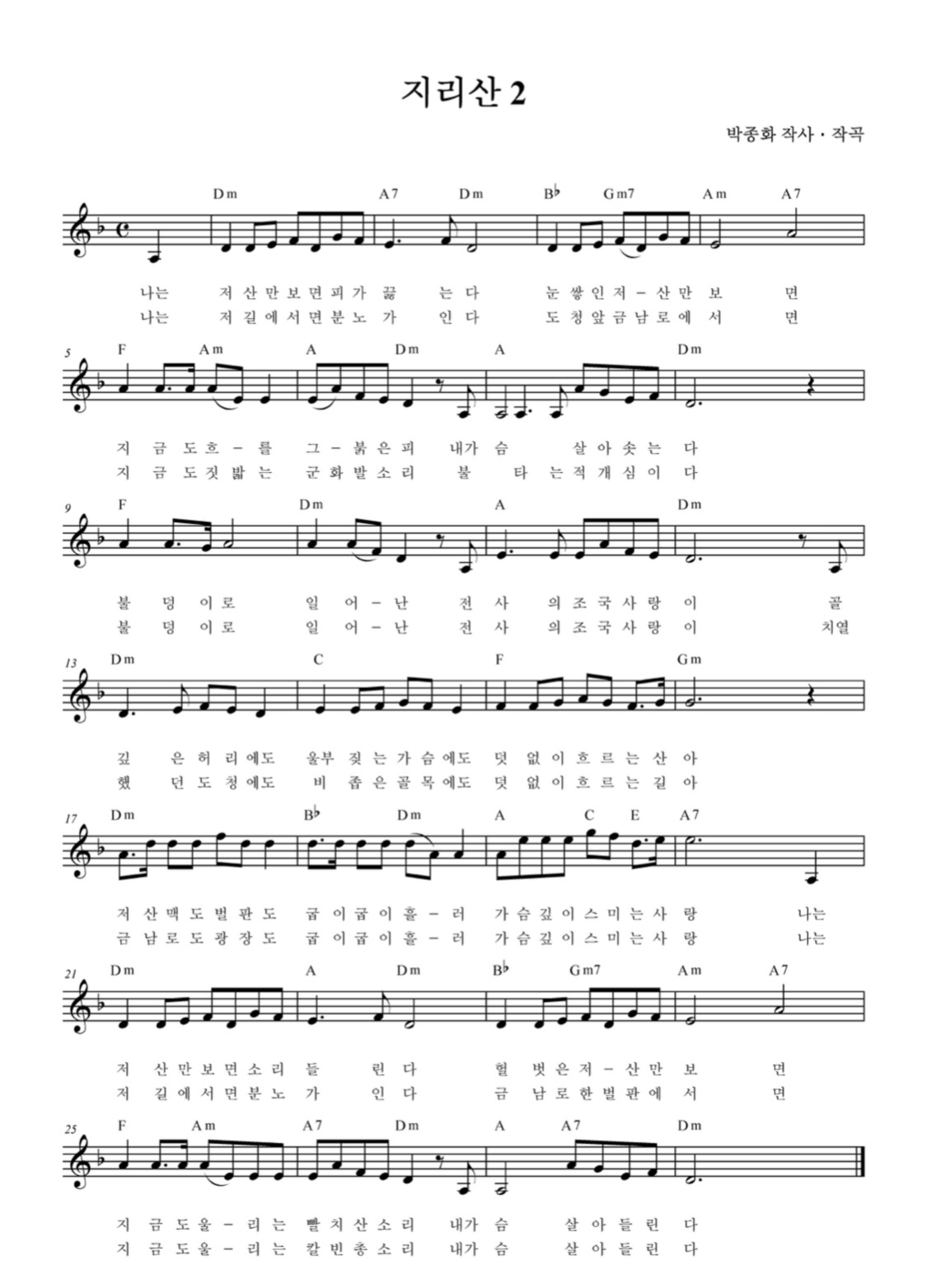 마지막으로 지금 내가 소개하는 “지리산”은 1989년 통일노래 한마당을 통해 소개되었던 곡이다. 입상을 했는지도 가물가물할 정도로 대중들에게 그리 잘 알려져 있는 노래는 아니다. 민중가요 노래패 중에서도 소수 마니아들만 아는 노래이고, 노래의 스케일은 저음과 고음을 넘나드는 대서사시 "이 산하에"나 "진혼곡"에 영향을 받은 듯하다. 예전에 1989년 통일노래한마당 악보집이 있었는데, 내가 대학을 졸업하며 후배에게 넘긴 후로 아직 가지고 있는지, 아님 어디서 썩고 있는지 확인하지 못하였다. 4옥타브 A까지 쌩목으로 불러야 하는 노래라 한때 록커를 꿈꿨던 내가 가장 애창하는 민중가요이기도 하다. 악보는 구할 길이 없어 가사만 옳긴다.