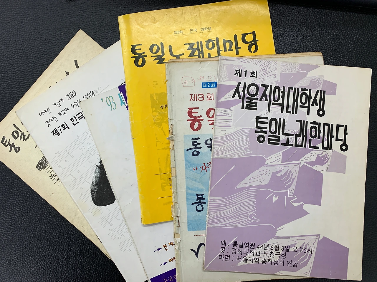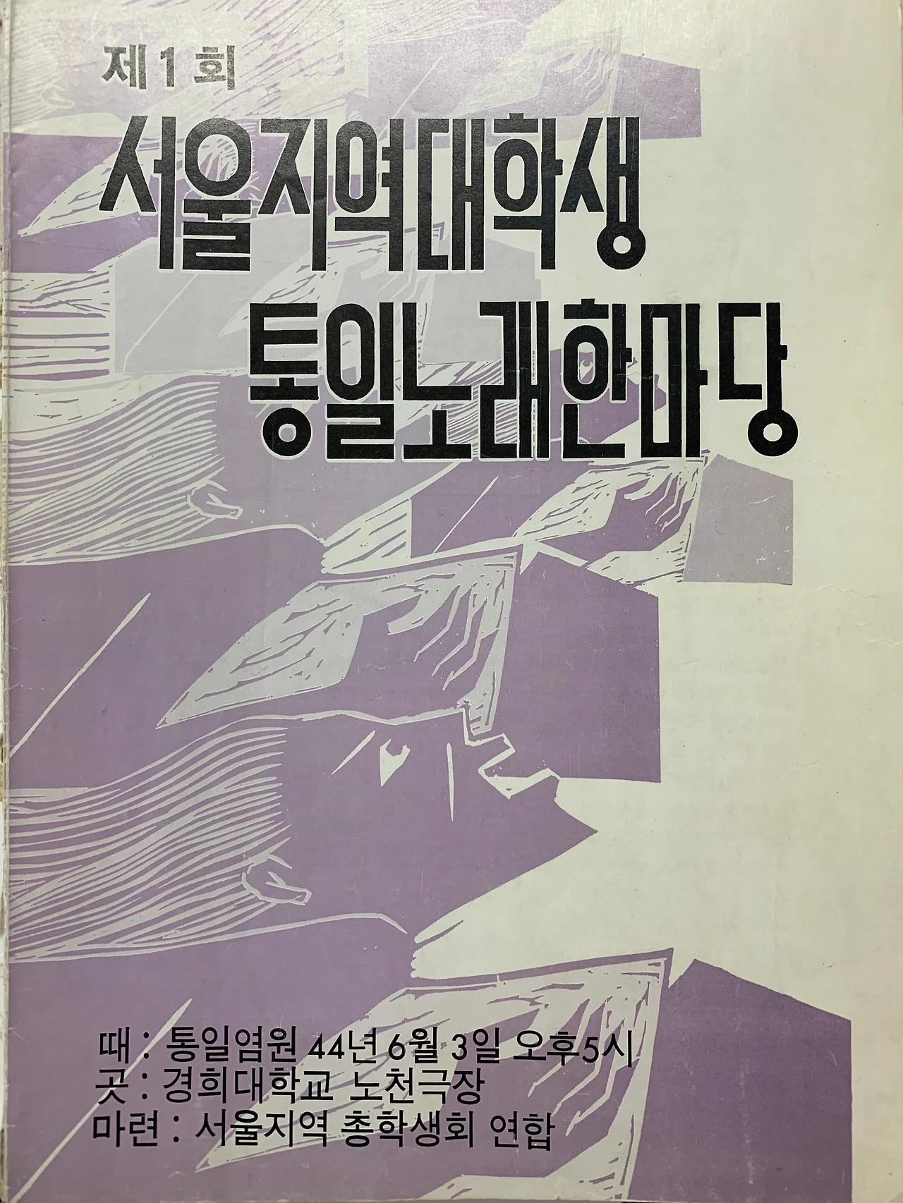 통일노래 한마당은 내가 대학 1학년 때인 1988년부터 시작되었다. 대중(?)들에게 잘 알려져 있는 "진혼곡", "얼굴 찌푸리지 말아요", "함께 가자 우리 이 길을" 등이 모두 통일노래한마당을 통해 발표된 노래들이다. 통일노래한마당은 MBC가 1977년부터 주최해오던 대학가요제가 대학생들의 정서를 반영하지 못하고 상업 가수를 배출해 내는 경연장으로 전락(?)해 가는 한 측면과, 대학생들이 청바지와 통기타로 대변되는 낭만적 저항에서 과학적 혁명 이론을 장착하게 되는 다른 측면이 교차하는 과정에서 등장한다. "나 어떡해(1977)", "밀려오는 파도 소리에(1978)", "내가(1979)", "꿈의 대화(1980)", 그리고 1983년 '에밀레'가 부른 "그대 떠난 빈 들에 서서"까지는 그래도 뭔가 콕 찝어 얘기할 수는 없지만 대중가요와 구분되는 대학가요만의 독특한 정서라는 것이 있었다. 그러나 1994년 "눈물 한방울로 사랑은 시작되고", 1995년 "저 바다에 누워"부터는 대학가요를 대중가요를 분리한다는 것 자체가 별 의미가 없어져 버렸다. 내가 1987년, 천지가 개벽하는지도 모르고 단과 입시학원과 독서실 사이를 전전하며 성공적으로 재수를 마칠 수 있었던 이유 중 하나도 대학생이 되어 대학가요제에 나가고 싶은 꿈이 있었기 때문이었다.