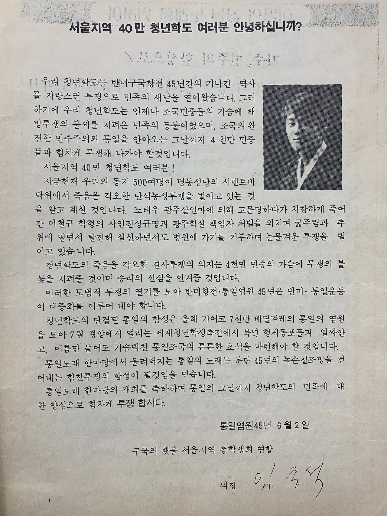 핏빛 금남로를 내달리며 우리 이렇게 맹서하자. 나는 민족해방 투쟁에 빛나는 오월전사의 후예임을 명심하고 학살원흉 처단과 육천만 민중의 절절한 염원인 조국의 평화적 통일을 위해 죽을 수도 물러설 수도 없다는 불요불굴의 투쟁정신과 결사항쟁의 자세로 끝까지 싸울 것이며 조국이 부른다면 의연하게 작은 육신이나마 바치겠노라고 엄숙히 맹서하자.