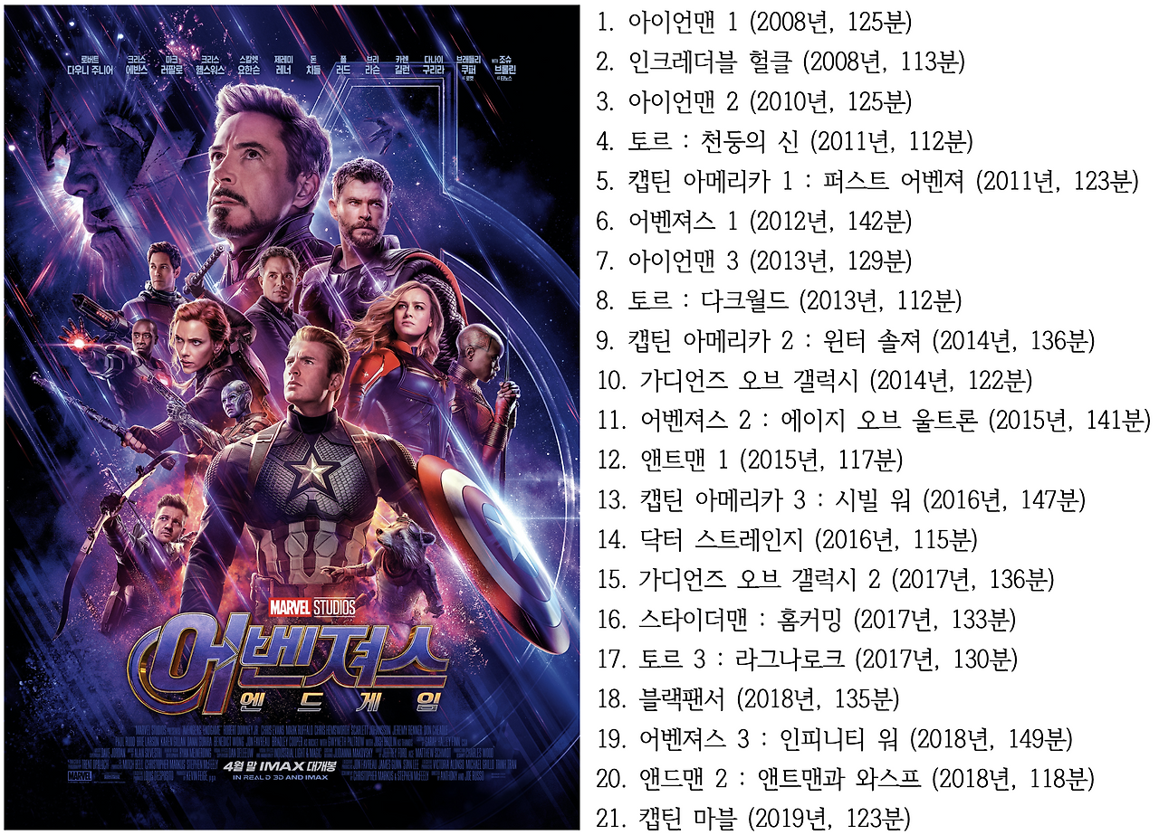 세계적으로 유명한 블록버스터인 어벤저스 시리즈가 얼마 전 마지막 에피소드인 “엔드 게임”으로 대단원의 막을 내렸다. 마징가 Z를 보며 TV에 입문하고, 로버트태권 V를 보기 위해 처음 극장에 발을 들여놓았던 필자는 어른이 되어서도 SF 영화라면 사족을 못 쓴다. 그런데 어벤저스 엔드 게임은 약간 사정이 달랐다. 엔드 게임을 제대로 이해하기 위해선 그 이전에 개봉되었던 21편의 영화를 모두 봐야 하기 때문이다.