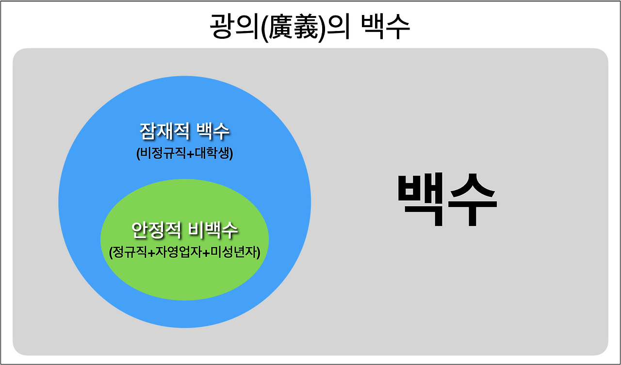 필자가 잘못했다. 그냥 그림으로 설명하겠다. 지속 가능한 경제 활동을 하고 있거나, 할 것으로 예상되는 모든 사람은 정규직 노동자, 비정규직 노동자, 자영업자 등이다. 경쟁적으로 취업 준비를 하고 있는 대학생과 헌법상 근로의 의무가 없는 미성년자도 비백수에 포함시키겠다.