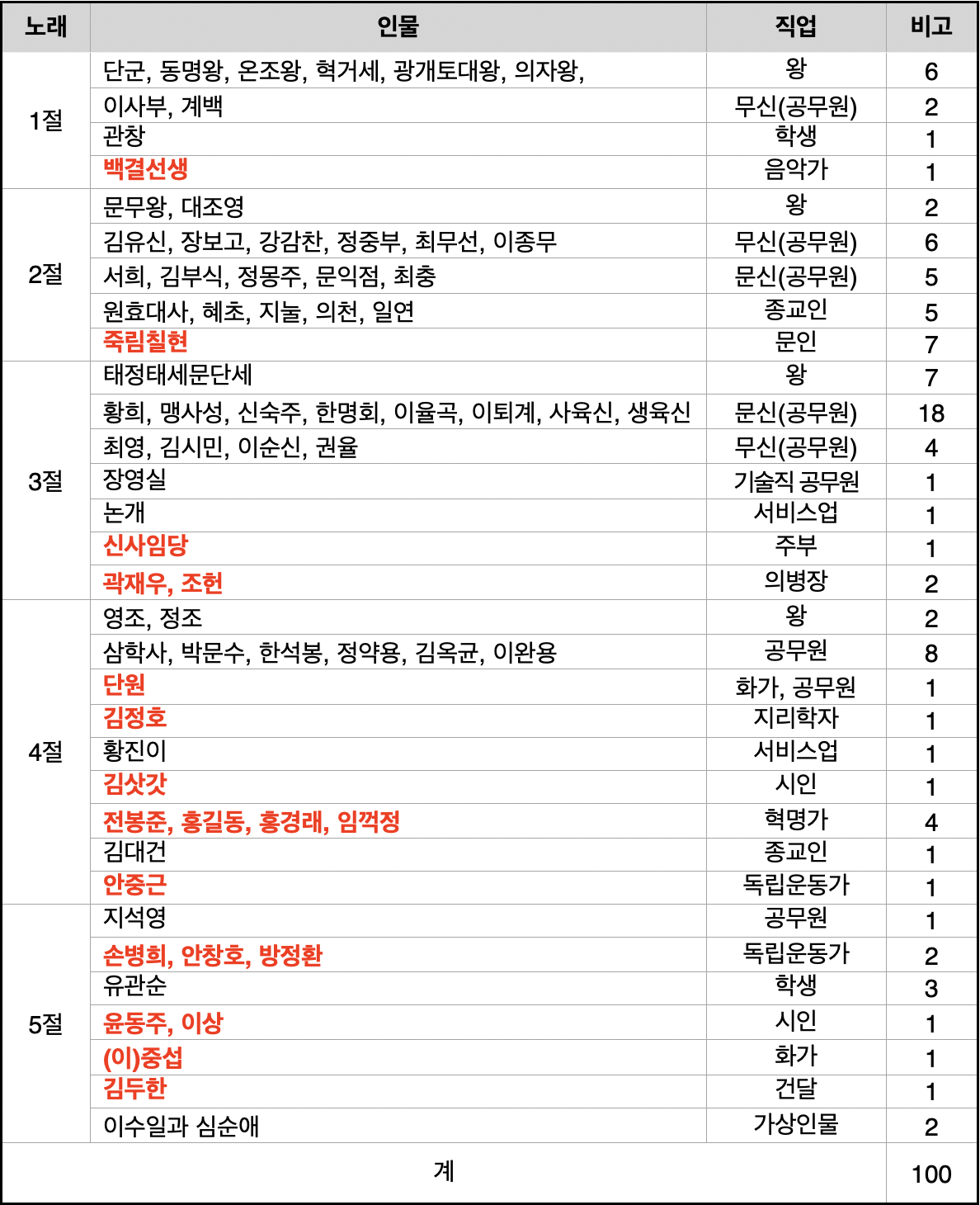이렇게 정리해 보니 한국을 빛낸 100명의 위인들 중에 백수로 의심되는 분들이 꽤 보인다. 신라의 거문고 명인 백결선생은 집안이 가난해 백번이나 기운 누더기 옷을 입고 다녀 백결(百結)이라는 닉네임으로 불렸지만, 가난에서 벗어나기 위해 노동을 하는 대신 거문고를 타 위인이 되었다. 고려 무신정권 시대 7명의 문인들은 죽림칠현을 결성하여 매일 술을 마시고 시를 지으며 놀아 당당하게 한국을 빛낸 100명 안에 들었다. 대한민국 최고액권 화폐인 5만 원권의 주인공인 신사임당은 사실상 조선시대 주부 백수였다. 역사가 곽재우와 조헌을 기억하는 것은 당시 관료로서의 업적 때문이 아니라 백수 시절 임진왜란에 맞서 일으킨 의병 활동 때문이다. 신윤복과 함께 조선시대를 대표하는 화가인 단원 김홍도는 임금님의 어진을 그리는 별제(別提)로서가 아닌 일반 서민들의 모습을 풍속화에 담은 백수 활동으로 더 유명해졌다. 기록이 부실해서 확실하지는 않지만, 대동여지도를 만든 김정호는 조선 팔도를 발로 누빈 백수였다.