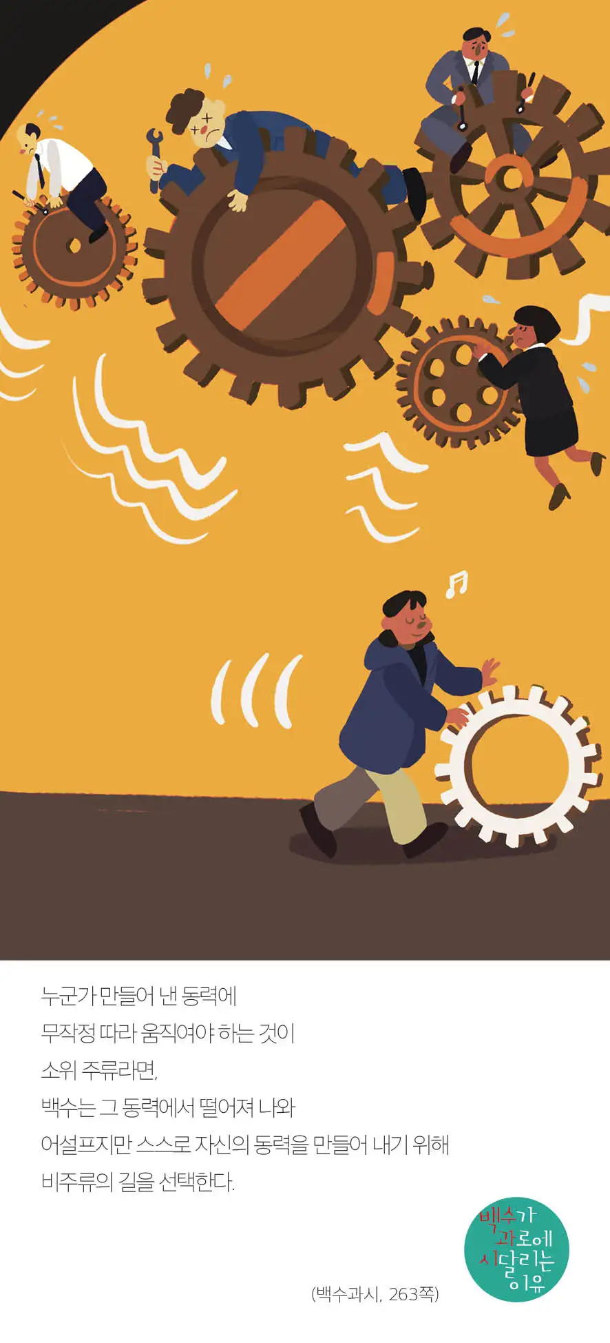 어느 시대나 주류와 비주류가 있다. 시대를 이끄는 것은 언제나 주류였다. 그러나 어떤 변화가 필요할 때 주류는 오히려 그 변화를 가로막는 강력한 힘이 되기도 한다. 교토대는 시의적절하게 비주류를 ‘허용’함으로써 일본 노벨상 최다 수상이라는 효과를 톡톡이 보고 있다. 백수는 이 시대의 주류로 살 것은 포기한 비주류다. 만약 우리가 살고 있는 사회를 무수히 많은 톱니바퀴들의 집합에 비유한다면... 그중에는 동력을 전달하는 톱니바퀴도 있을 것이고, 주위의 톱니바퀴가 돌 때 무작정 따라 도는 톱니바퀴도 있을 것이다. 어떤 톱니바퀴는 윤활유가 없어 빡빡하게 돌 수도 있고, 큰 톱니바퀴가 한 바퀴를 돌 때 수 십 바퀴를 돌아야 하는 작은 톱니바퀴도 있을 것이다. 누군가는 동력이 전하는 방향과는 반대로 힘을 써보기도 하지만, 그럴 때마다 이미 구조화된 거대한 동력에 의해 톱니바퀴가 빠그라져 나가는 경헝을 해 왔다. 누군가가 만들어 낸 동력에 무작정 따라 움직여야 하는 것이 소위 주류라면, 백수는 그 동력에서 떨어져 나와 어설프지만 스스로 자신의 동력을 만들어 내기 위한 비주류의 길을 선택했다.